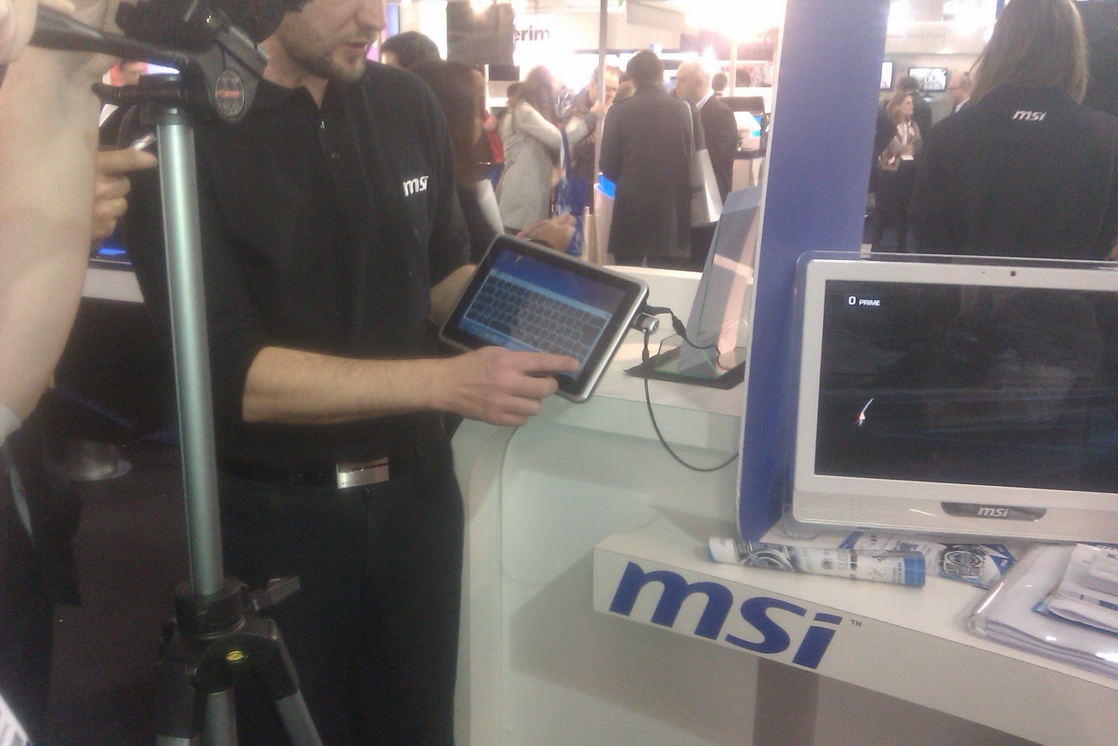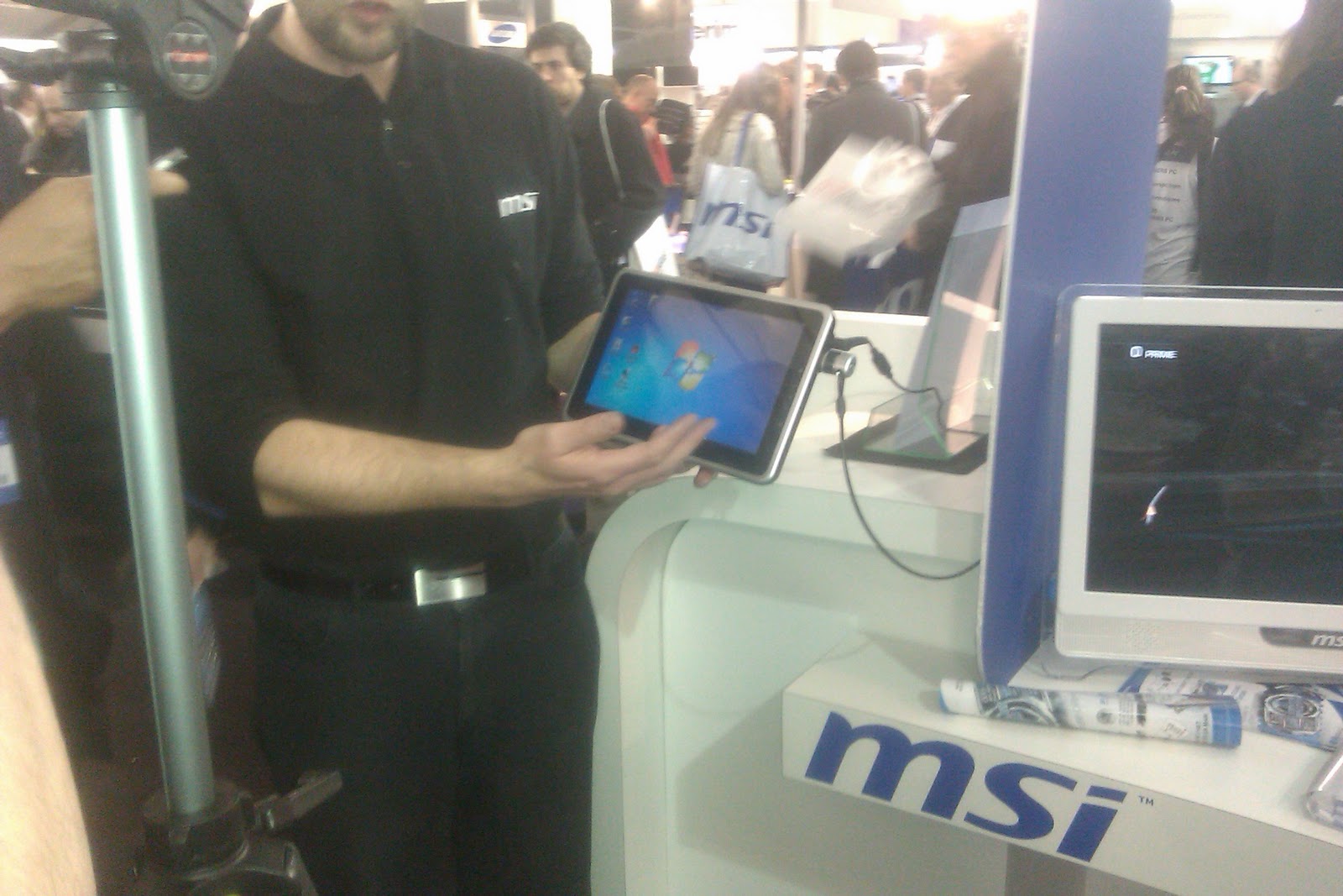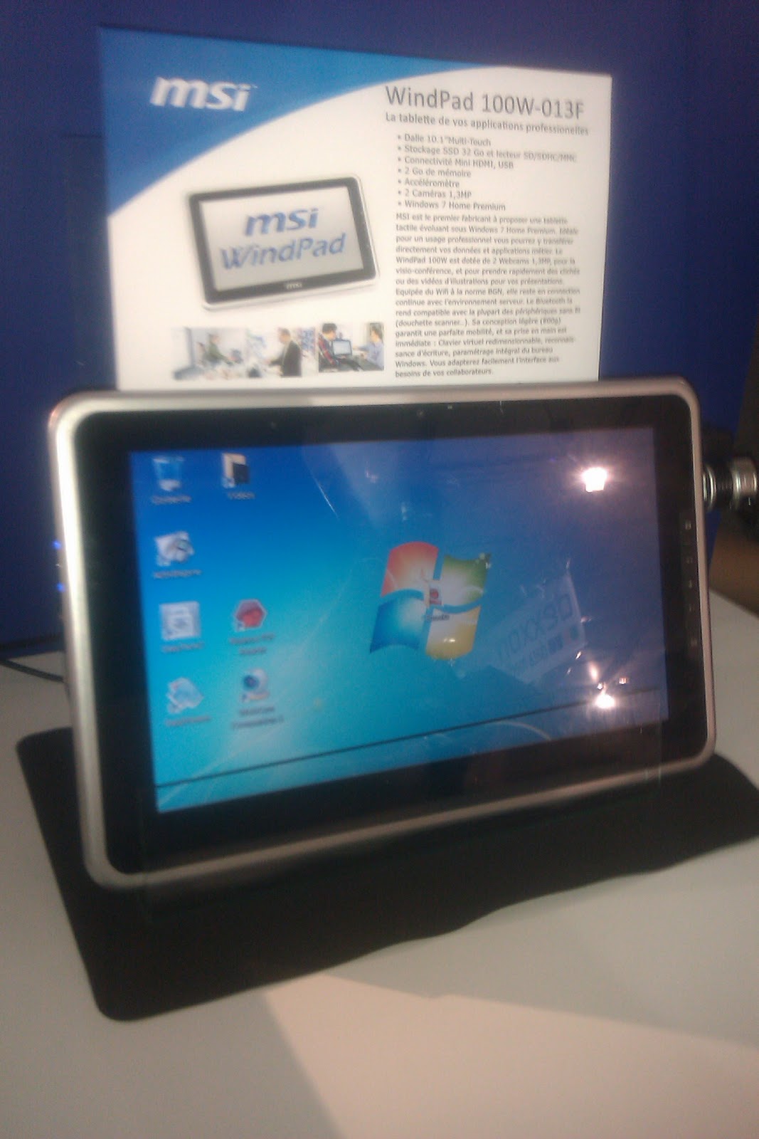 C’est visiblement MSI qui va dégainer sa tablette Windows 7 dans les prochains jours. J’ai pu voir fonctionner un exemplaire à l’IT partners ce jour. La tablette semble réactive, elle dispose de 2Go de mémoire vive et d’une capacité de 32Go en stockage flash. Le processeur qui "motorise" l’ensemble est un Atom Z530. Une caméra avant et une à l’arrière complètent l’ensemble. Un prix public est annoncé entre 499 et 549 TTC. Bien entendu, le produit même s’il semble sympathique, a du mal à rivaliser niveau look avec l’Ipad. L’aspect est un peu "quincaille" et pour moi le point noir est la qualité de l’affichage que j’ai trouvé très décevant.
