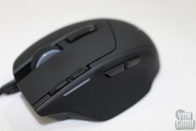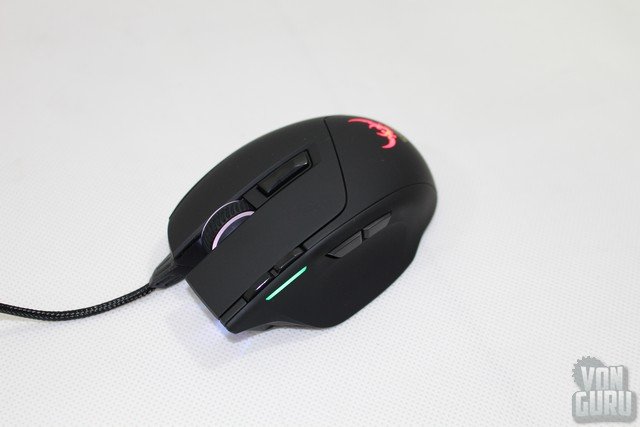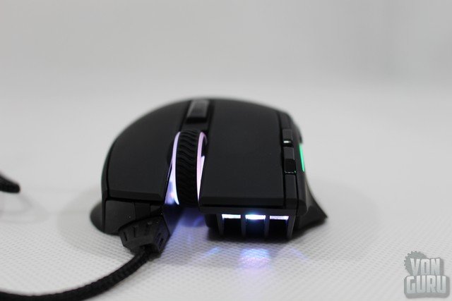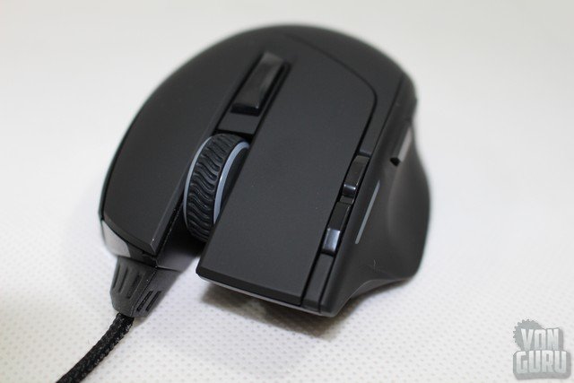 La Sabre est une souris relativement imposante et cette taille lui permet de pouvoir disposer ses 8 boutons de manière intelligente. En effet, si les 2 boutons principaux n’amènent pas de remarques particulières, l’asymétrie de la partie gauche permet un excellent placement des quatre autres boutons.