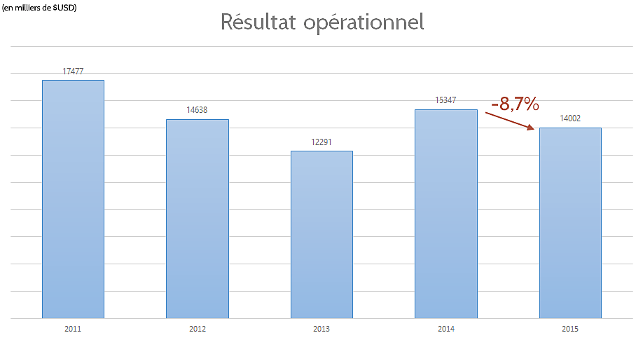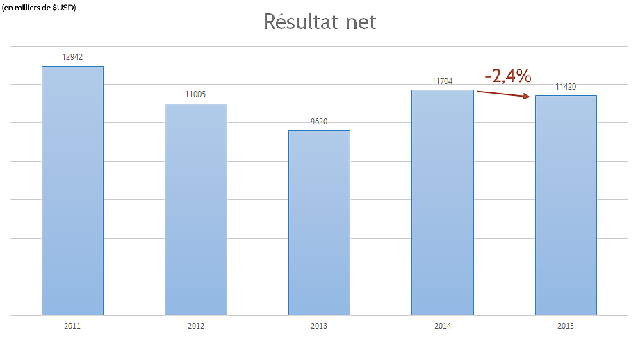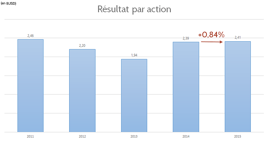 Enfin, sur le plan opérationnel, malgré une baisse du résultat opérationnel (en recul de 9% par rapport à 2014 à 14 milliards de dollars), le groupe maintient un très bon résultat net (11,4 milliards) avec un recul limité à 2 % par rapport à l’année précédente. Mieux encore : le résultat par action (2,33 USD) a progressé du fait de la baisse du nombre d’action entre 2014 et 2015.