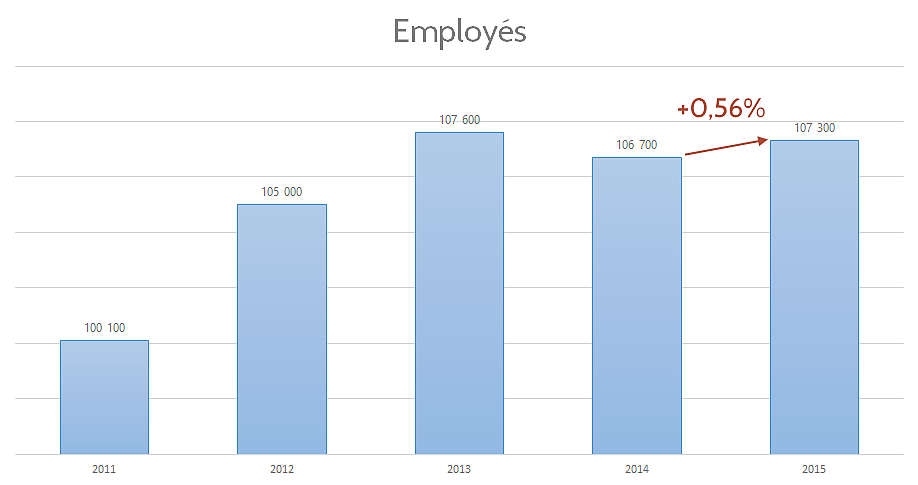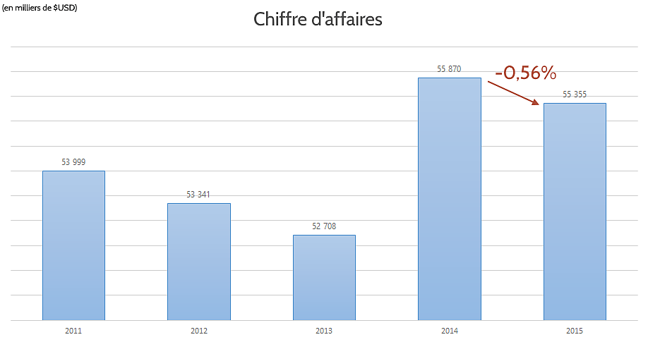 Ainsi, pour 2015, l’entreprise réalise un chiffre d’affaires de 55,4 milliards USD contre 55,9 en 2014. Plusieurs secteurs sont en croissance par rapport à 2014 :