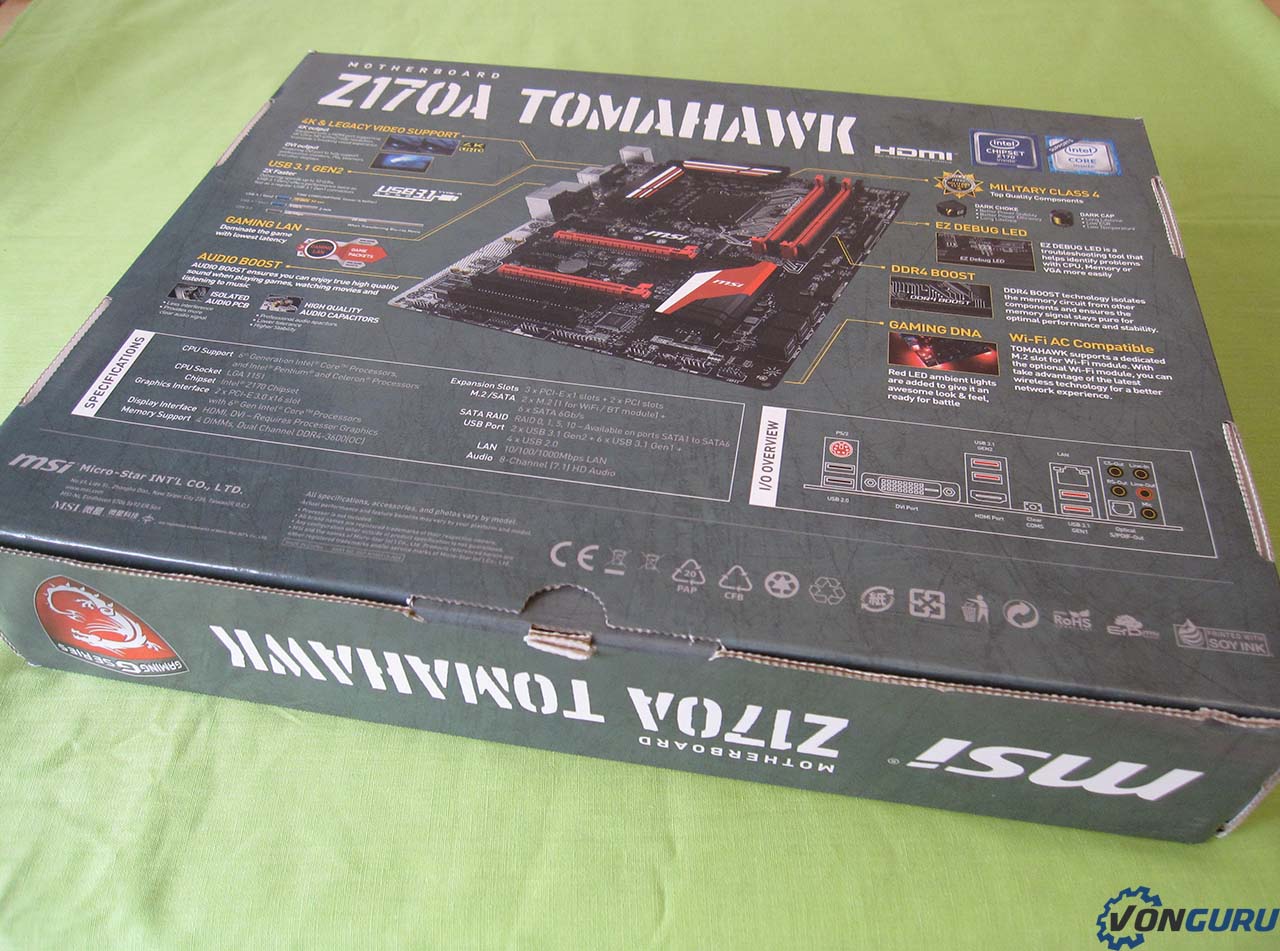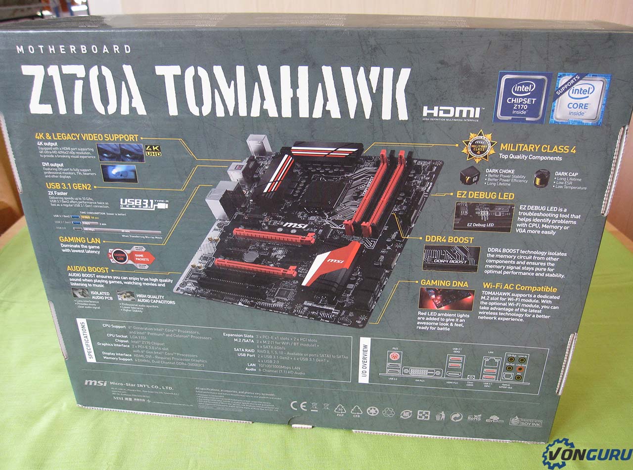 Passons à l’arrière de la boîte où l’on découvre les spécificités de cette Z170A Tomahawk, qui sont moins nombreuses sur cette entrée de gamme.