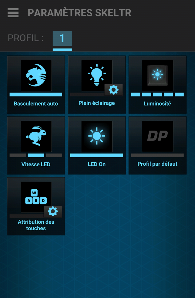 Pour finir sur la modification du clavier, il y a bien évidemment le rétro-éclairage. Sur le Skeltr vous pourrez modifier la couleur des touches du clavier, mais aussi les quatre LED qui se situent de chaque côté de celui-ci. Différents modes s’offriront à vous : Plein éclairage, Extinction, Respiration, Battement, Clignotant et enfin Impulsions.