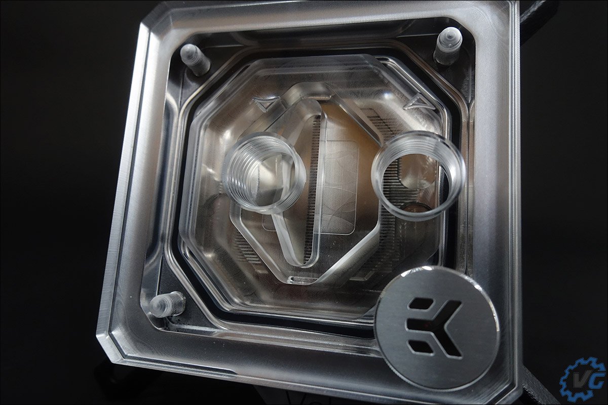 - Le top en acrylique dispose de deux parties filetées pouvant accueillir des embouts G1/4. Sur la face supérieure on retrouve deux triangles indiquant l’entrée et la sortie du liquide. Les embouts ne sont pas fournis avec le waterblock et devront s’acheter séparément.
