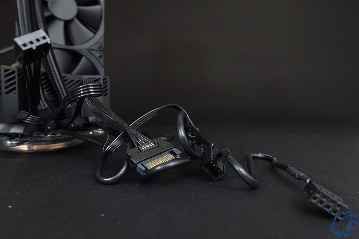 Pour terminer, branchez les deux ventilateurs, le connecteur USB ainsi que l’alimentation SATA. Vous pouvez brancher le connecteur « Fan » du waterblock sur le « CPU-Fan ». Je vous conseille d’opter pour un branchement sur le « AIO-pump » si votre carte mère dispose de cet emplacement. La pompe est très silencieuse et tournera à une vitesse plus élevée sur ce connecteur.