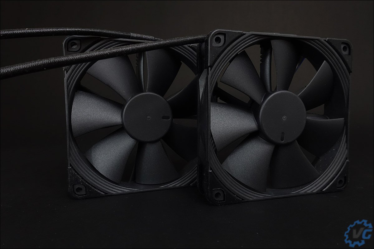 Le radiateur en aluminium qui équipe ce RYUJIN est la version 240 mm surmonté de deux ventilateurs de 120 mm. Ses dimensions sont de 272 x 121 x 27 mm. Les ventilateurs portent la référence IPPC-2000 de la marque Noctua. Quand on connait la réputation des ventilateurs Noctua, on se dit que Asus a fait le bon choix ! Ce modèle bénéficie d’un débit maximum de 122 CFM pour une vitesse pouvant varier entre 450 et 2000 RPM. Les nuisances sonores annoncées sont de 29,7 dB(A). Je vérifierai si c’est bien le cas lors des tests. Afin d’atténuer les vibrations, les deux ventilateurs disposent de pads en caoutchouc à leurs quatre extrémités et de part et d’autres.