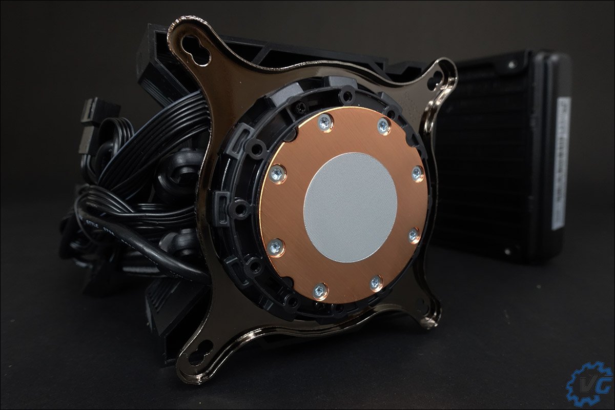 Attardons-nous maintenant au waterblock, la partie en contact avec le processeur dont les dimensions sont de 100 x 100 x 70 mm. Au premier coup d’œil, on reconnait la base en cuivre des modèles Asetek ainsi que le système de fixation propre à la marque. Celle-ci dispose d’un pad thermique pré-installé que je n’utiliserai pas lors de tests. L’idée est de conserver un protocole identique avec mes tests précédents en utilisant de la MX-4. Tant que nous sommes à parler de la fixation, le RYUJIN est compatible avec les sockets Intel LGA-115x/1366/2011/2011-3/2066 et AMD AM4/TR4. Le waterblock intègre une pompe dont le rôle est d’assurer la circulation du liquide. Il n’est pas possible de faire l’appoint ou de vider le circuit sur ce modèle.