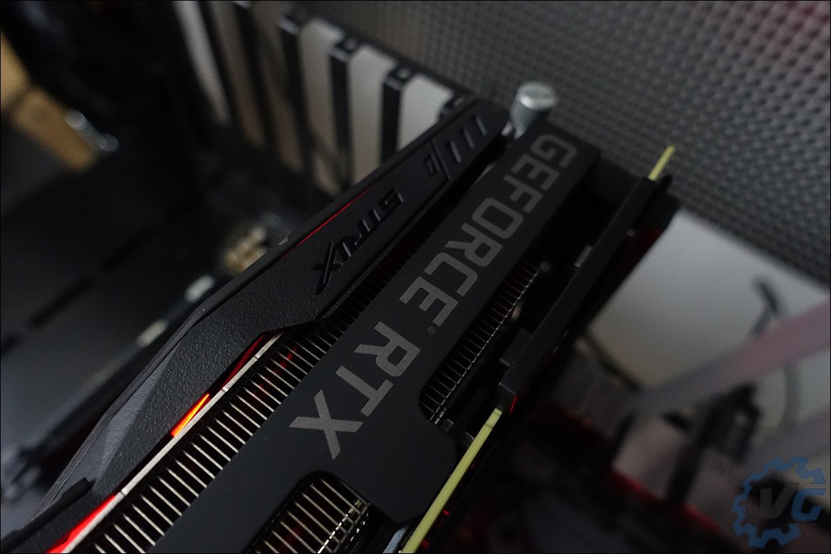 Pour finir, on retrouve à l’arrière une backplate avec le logo Asus « ROG » qui s’illumine et qui peut être contrôler via le soft AURA. Plusieurs mode sont disponibles : statique, pulsation, stroboscopique, cycle de couleurs, musical et en fonction de la température. Un bouton ON/OFF permet de désactiver l’éclairage en une simple pression. L’alimentation de cette RTX 2080Ti Strix OC se fait via deux connecteurs 8-pin. Enfin, au niveau des sorties vidéos, on a droit à deux ports HDMI 2.0b, deux Display port 1.4 et un port USB de Type-C.