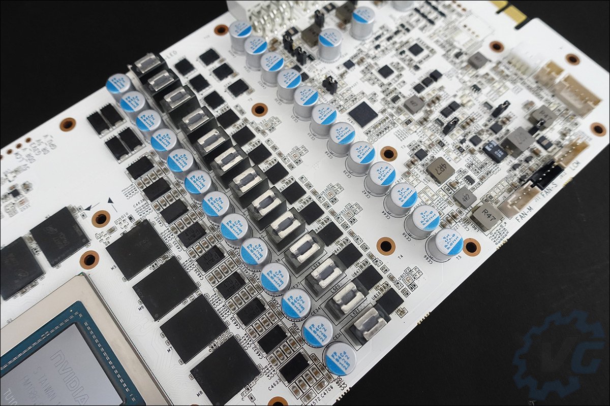 Depuis plusieurs années, la caractéristique principale des cartes graphiques haut de gamme de chez GALAX est le choix d’un PCB blanc. Cette RTX 2080 Ti HOF OC Lab ne fait pas exception et il n’y pas à dire, çà en jette pas mal ! Notre modèle dispose d’un overclocking d’usine avec une fréquence GPU à 1350 MHz, pour un Boost à 1755 MHz et les 11 Go de GDDR6 sur un bus de 352 bits sont cadencés à 1750 MHz. Les puces mémoires 8SA77 D9WCW sont des Micron. Le PCB blanc, composé de pas moins de 12 couches, n’est bien sur pas celui proposé par NVIDIA. Il a été entièrement revu par GALAX avec l’utilisation de composants hauts de gamme, afin d’offrir les meilleurs performances aux overclockeurs.