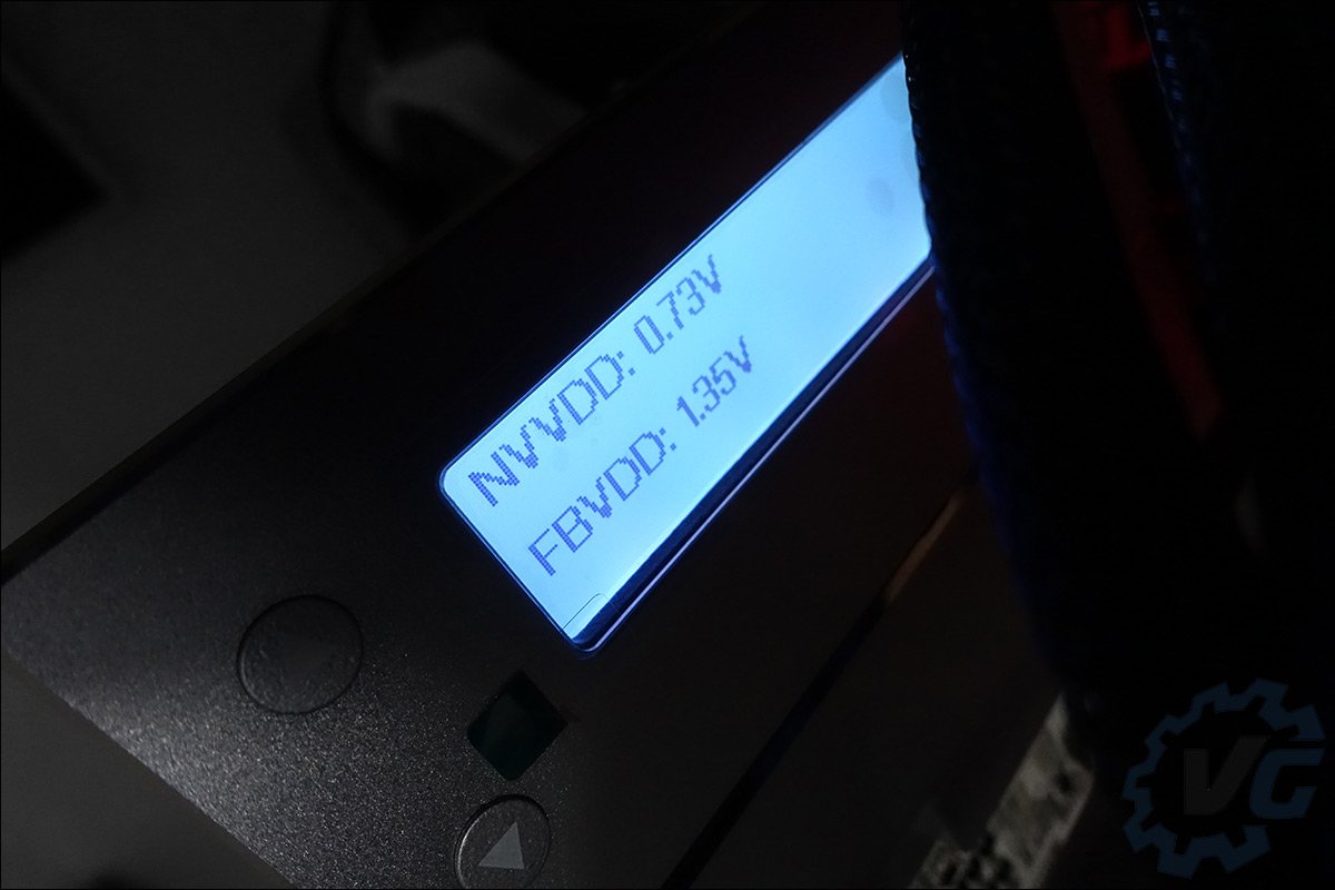 Sur la partie supérieure du PCB on retrouve une zone permettant de mesurer les tensions à l’aide d’un multimètre : 5v, 1v8, PCI, 5V_MCL, DDR, G3V3, DR_5V et le GPU. Cela peut sembler être un gadget, mais cela s’avère très utile et très important afin d’avoir un œil constant sur la tension délivrée lors des tests sous froid. Une tension trop élevée peut conduire à la mort prématurée de votre carte graphique.