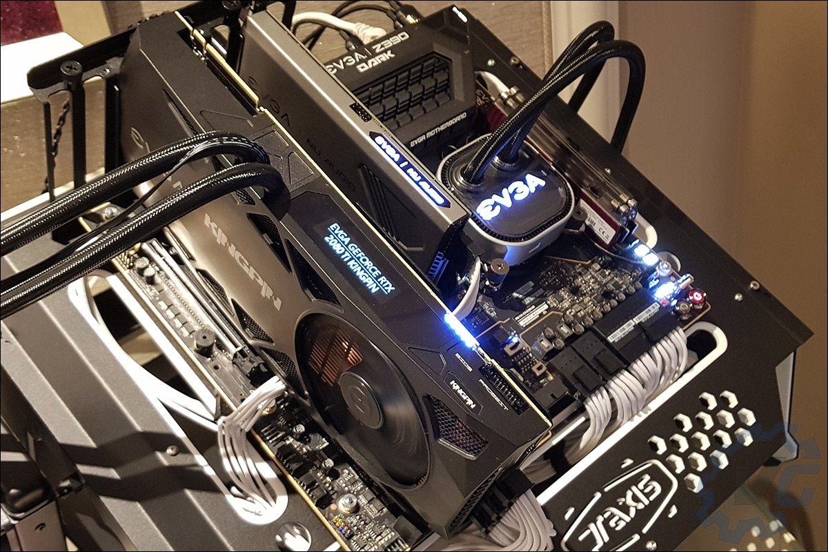 Voici donc les premières photos de la carte graphique EVGA RTX 2080 Ti KingPiN. Comme nous le stipulions hier dans notre brève, elle dispose d’un système de refroidissement hybride de type AIO CLC afin de tenir au frais les composants du PCB. Le nombre de phases de l’étage d’alimentation serait de 19 mais difficile de savoir si il s’agit d’un 16 + 3 ou de 19 phases uniquement pour la puce graphique. La puce GPU bénéficie d’un refroidissement liquide, la mémoire et l’étage d’alimentation sont surmontés d’un radiateur sur lequel est placé un ventilateur de 100 mm.