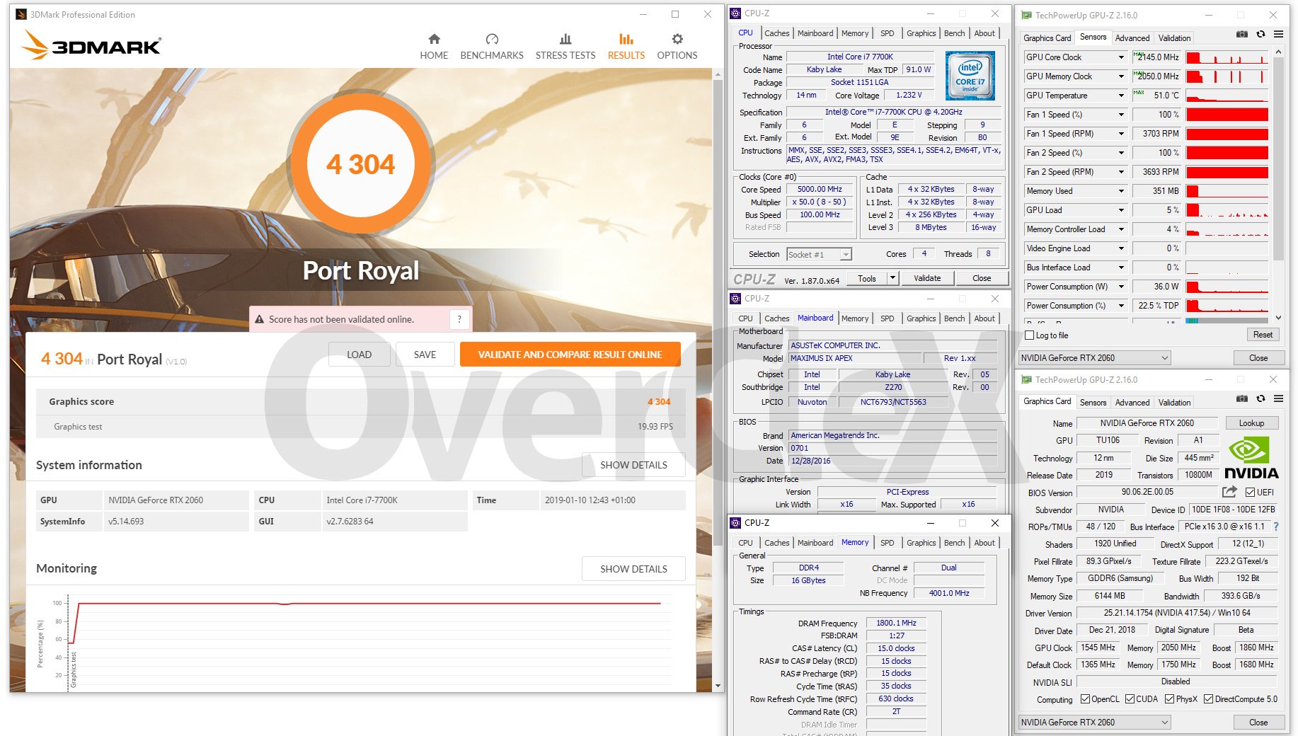 3DMark Port Royal est le dernier benchmark en date de UL Benchmark, anciennement Futuremark. Il s’agit du premier benchmark prenant en charge le « ray tracing » et qui permet ainsi aux utilisateurs de comparer leurs performances. Le test s’effectue en 2560 × 1440. Pour rappel, cette nouvelle technologie est arrivée avec les RTX 2080Ti, 2080, 2070 et 2060. À l’heure actuelle, ce sont les seules cartes compatibles.