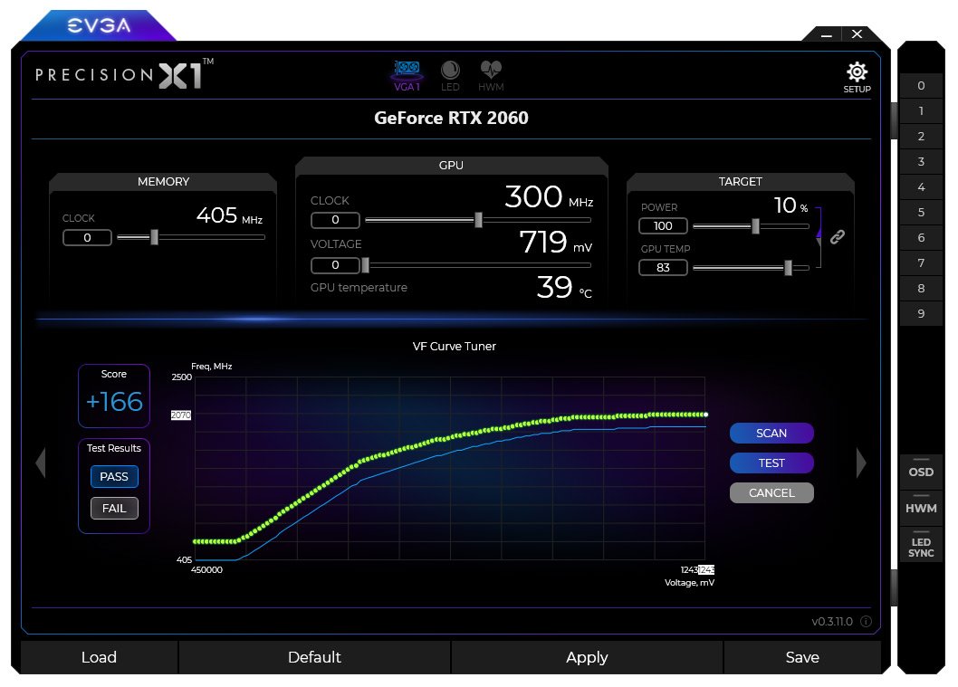 Le logiciel Precision X1 propose également un onglet test. Vous pourrez ainsi vérifier la stabilité de votre carte graphique (RT cores, Tensor Cores, Cuda Cores, mémoire…). À noter que pour l’overclocking de la mémoire, vous devrez le faire manuellement. La plupart des cartes prennent facilement 1950 voire 2000 MHz. La version 0.3.11 bêta de Precision X1 que nous avons utilisé est à présent compatible avec les cartes graphiques GTX 10xx.