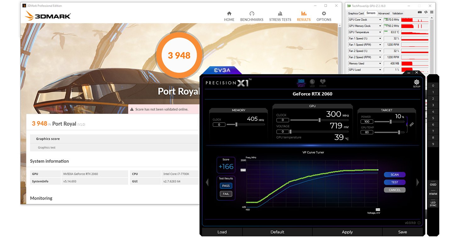 Voici les captures obtenues après le scan. La meilleure fréquence Boost annoncée est de 2070 MHz. Je me suis donc placé sur le point vert à l’extrémité de la courbe et puis j’ai validé cette fréquence. Après avoir testé cette fréquence sur le benchmark Port Royal, celle-ci correspond bien à la fréquence maximale de 2070 MHz.