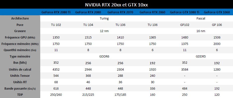 NVIDIA n’en est pas à son coup d’essai avec les modèles RTX, puisque cette 2060 débarque dans le prolongement logique de la 2080 Ti, 2080 et 2070. Cette RTX 2060 est construite autour de l’architecture Turing et s’annonce comme la plus abordable des RTX à l’heure actuelle. La sortie de cette carte n’est pas sans rappeler celle de la GTX 1060 qui était devenue très rapidement la référence pour le Full HD (1080p). Pour rappel, nous vous proposons un tableau récapitulatif de cette nouvelle architecture Turing. Nous y avons ajouté la GTX 1080 Ti et la version 1060 :
