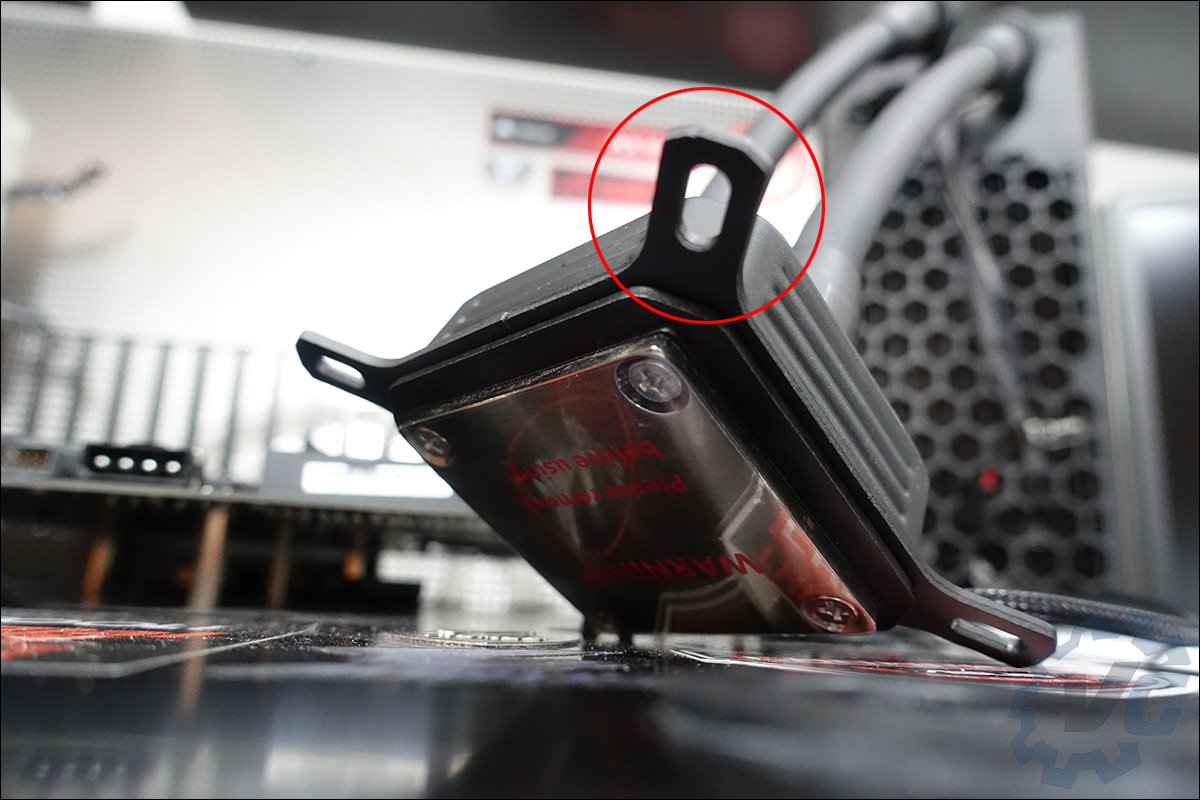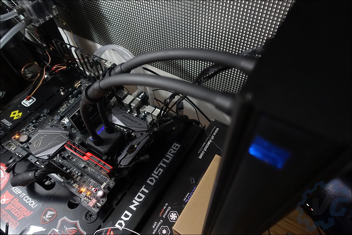 Le serrage n’est pas évident du à la rigidité des tuyaux. De part leur longueur et leur matière, ils est assez difficile de les courber. Une fois le serrage terminé, Alphacool prévoit des capuchons plastiques noirs afin d’avoir un rendu plus propre.