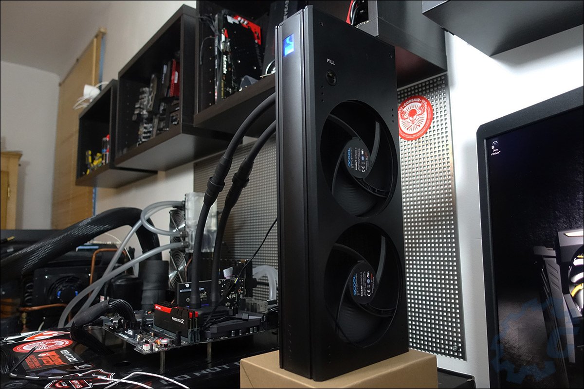 Tout d’abord, l’élément qui frappe aux yeux, c’est l’imposant radiateur NexXxoS ST30 de 280 mm de chez Alphacool. Il s’agit d’un modèle dont tous les éléments internes sont en cuivre. Il est protégé dans un caisson en aluminium dont les dimensions sont de 385,5 x 156 x 64 mm. Vous allez me dire que par rapport à la taille du radiateur, çà fait un peu grand, non ? C’est exacte et la raison est simple. Ce caisson, en plus d’accueillir le radiateur, protège les deux ventilateurs et dissimule la pompe ainsi que le réservoir.