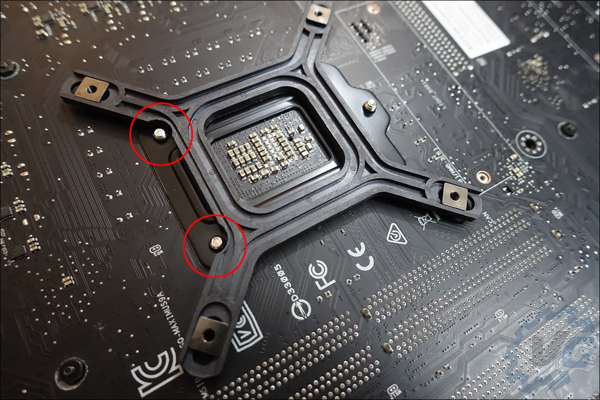 L’étape suivante consiste à placer le support de fixation à l’arrière de votre carte mère. Attention, celui-ci doit être placé de tel manière à ce que les encoches soit du côté des deux vis de maintien du socket. Il s’agit des deux cercles rouges que j’ai mis sur la photo.