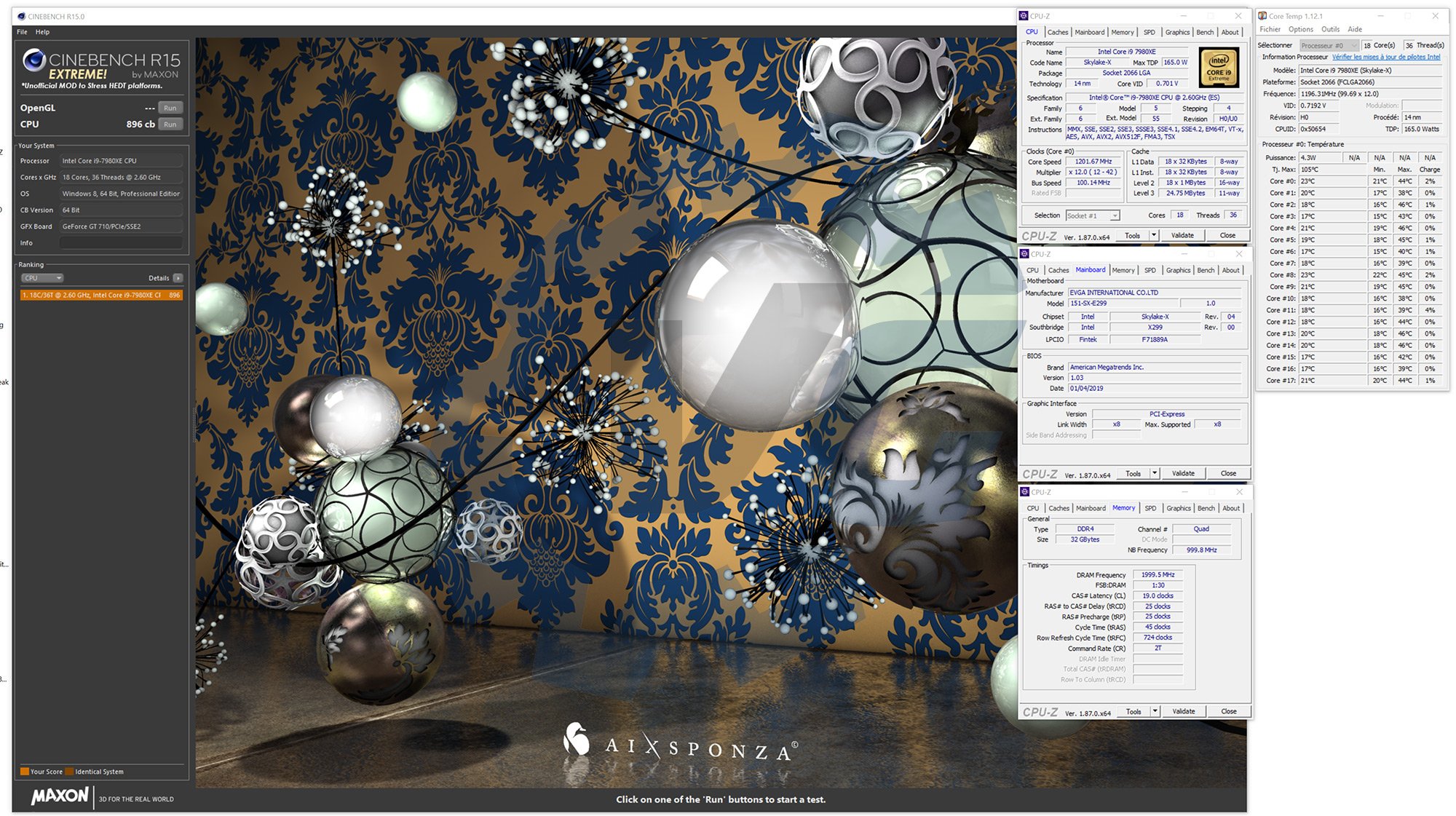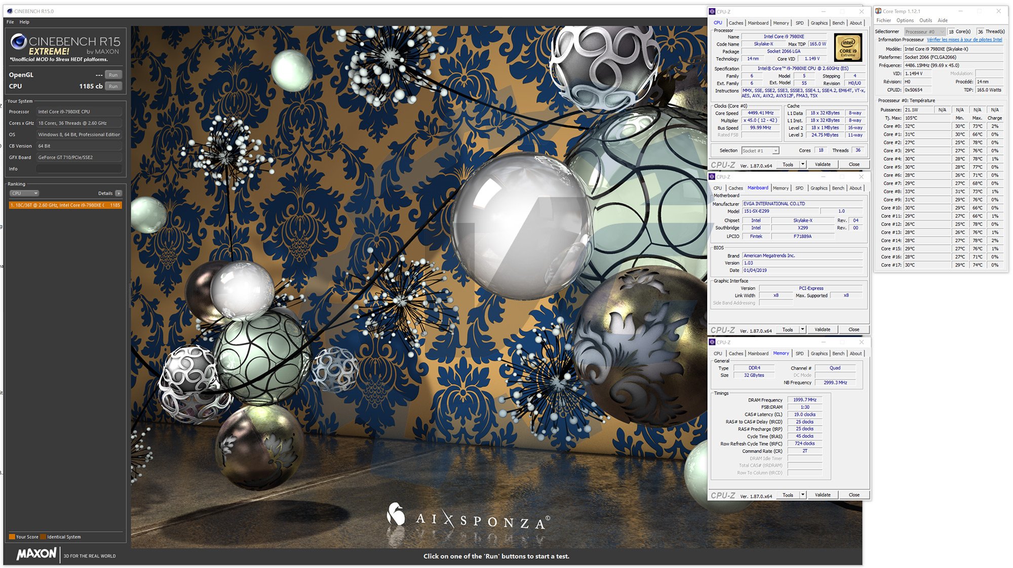 Il ne s’agit pas d’une version officielle mais juste modifiée avec une charge de travail quadruplée. L’idée est de prolonger la durée du test afin de pousser tous les cœurs à 100 % d’utilisation. À l’heure actuelle, les processeurs disposent de plus en plus de cœurs et la course à celui qui en aura le plus a été lancée. Cette nouvelle version de Cinebench est donc destinée aux processeurs disposant de nombreux cœurs comme le i9-9980XE d’Intel (18 cœurs) ou la version Ryzen Threadripper 2990WX (32 coeurs) d’AMD. Nous sommes justement entrain de réaliser un comparatif entre le i9-7980XE et le i9-9980XE, j’en ai donc profité pour tester ce Cinebench R15 Extreme.