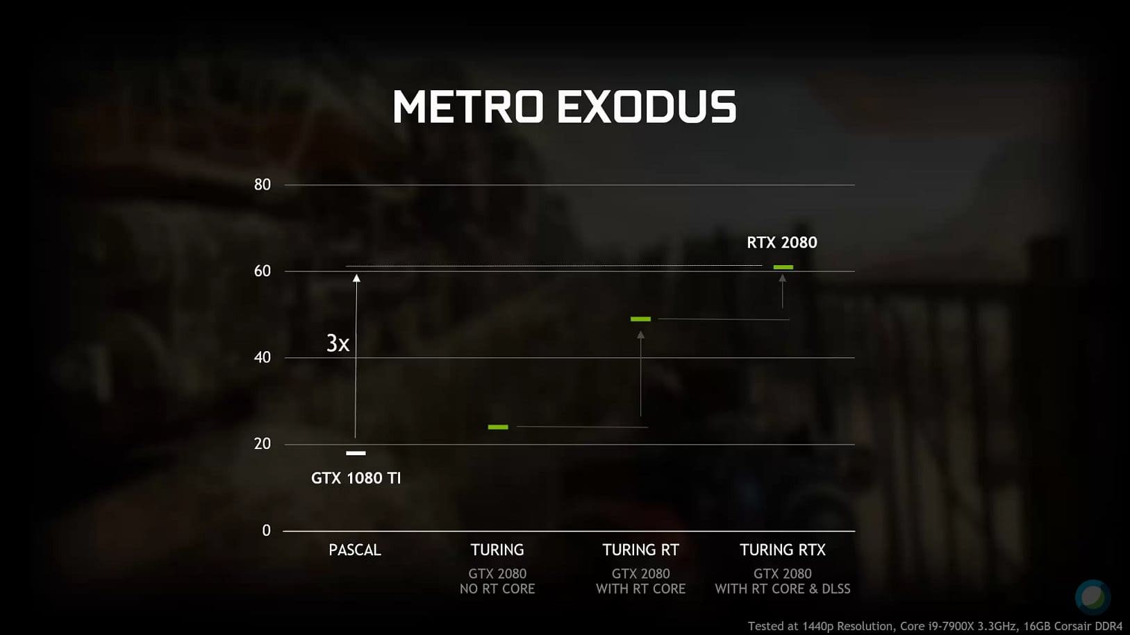 En effet, Nvidia annonce un Ray Tracing plus light que celui rendu en temps réel sur ses « cartes spécialisées », les RTX. Par ailleurs selon les graphiques, il ne faut pas non plus espérer du 60 images par seconde en DXR ON. En somme, Nvidia met en garde quant au moteur de jeux utilisé. Une 1080 Ti pourra s’en sortir en 1440p ultra à 45 images par seconde sur Battlefield V face à une 2080 trônant à 80 environ. A contrario sur Metro Exodus, il n’en sera rien. Une 1080 Ti, n’ayant pas de cœurs RT pour faciliter le traitement du DXR, aura du mal à décoller un malheureux 20 images par secondes.