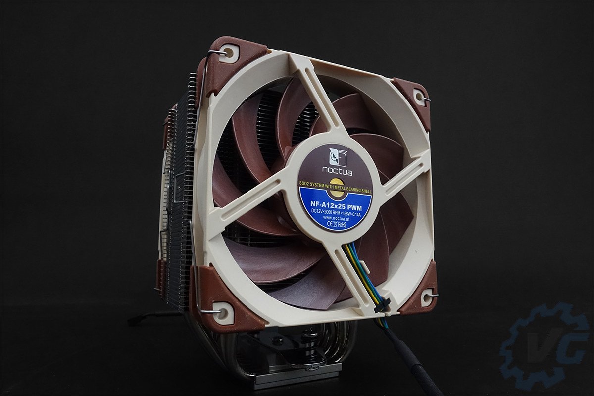 Attardons nous tout d’abord sur ce qui frappe aux yeux, les deux ventilateurs. Il s’agit des modèles portant la référence NF-A12x25 PWM en 120 mm. Au niveau des caractéristiques, on a droit à une vitesse variant de 450 à 2000 RPM pour un débit d’air de 60.09 CFM et une pression statique de 2.34mmAq. Sachez que vous retrouverez dans le bundle deux résistances LNA pour passer à 1700 RPM. Les ventilateurs sont placés d’origine en push/pull. Ce ventirad se présente avec des dimensions de 125 x 112 mm (ventilateurs compris) pour une hauteur de 158 mm. Il affiche un poids de 760 grammes. Sa base en cuivre transfère sa chaleur vers un ensemble d’ailettes en aluminium à l’aide de sept caloducs en cuivre