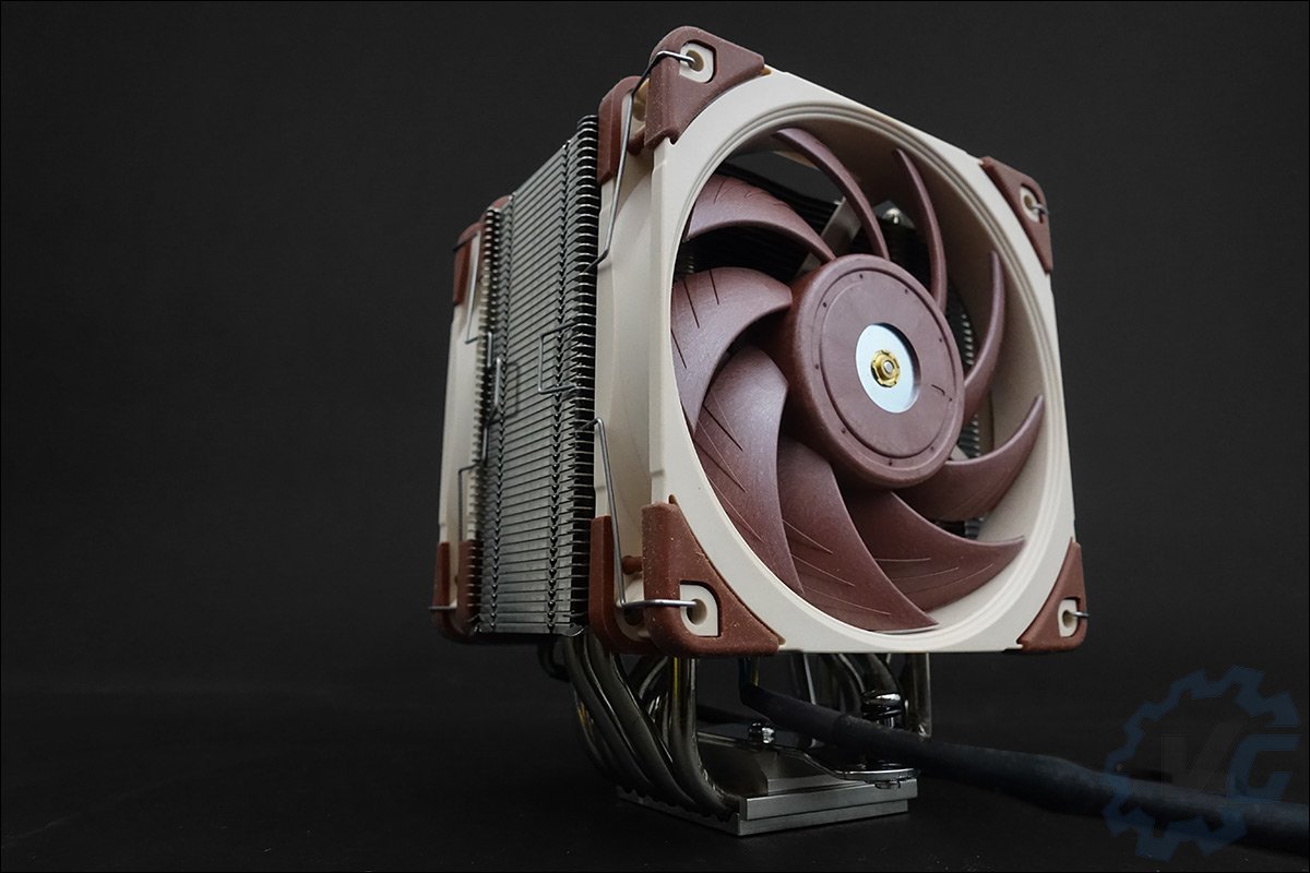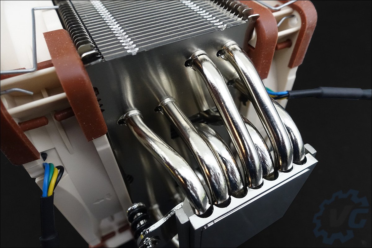 Ces deux ventilateurs viennent se placer de part et d’autres du radiateur composé de sept caloducs de 6 mm de diamètre. L’idée pour Noctua est de proposer une solution de refroidissement aussi efficace qu’une version de 140 mm. Reste toujours à voir la compatibilité d’un tel ventirad avec les emplacements mémoires de votre carte mère. Ce qui est aussi impressionnant, c’est son poids total de 1220 g (760 grammes sans les ventilateurs).