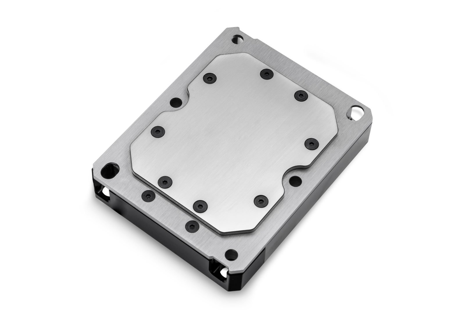 Le second block viendra se placer sur l’étage d’alimentation et qui sera très utile. Les premiers tests laissent sous entendre que le dégagement de chaleur est assez important à ce niveau. Le waterblock EK-VRM permettra ainsi de le tenir au frais et par la même occasion faciliter l’overclocking. Le waterblock se compose de deux éléments et reprend la même finition que le block CPU. Il bénéficie lui aussi d’un badge EK rétroéclairé.
