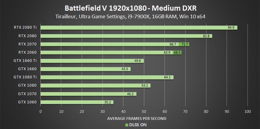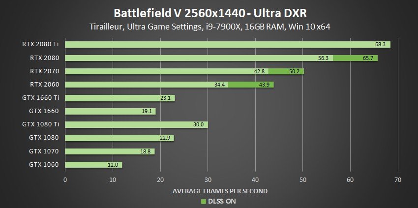 La 1080Ti se retrouve alors au rang d’une 2060 en 1440p une fois le DXR actif en ultra sur Battlefiled V. Nous remarquons par contre qu’une fois activé en medium 2160p, la 1080Ti se permet de flirter avec la 2070. Si nous activons alors le DLSS, la 2070 devient intouchable. Il ne faut pas se voiler la face, la GTX est à genoux. Nvidia laisse d’ailleurs toute une batterie de benchmarks différents ici.
