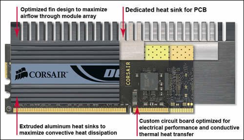 Les Corsair Dominator Platinum bénéficient d’un PCB de couleurs noirs composé de 10 couches afin de garantir notamment la qualité du signal. Les deux dissipateur thermique Dual-Path DHX sont en aluminium anodisé noir mat avec au centre, le logo Corsair. Le rôle des dissipateurs thermiques est d’assurer la dissipation de la chaleur mais aussi via les couches de cuivre, intégrées directement dans le circuit imprimé. Sur la partie supérieure du module, on retrouve l’arche dans laquelle sont insérées dix petites fenêtres ainsi que le nom Dominator. L’ensemble sera illuminé par les 12 leds adressables.