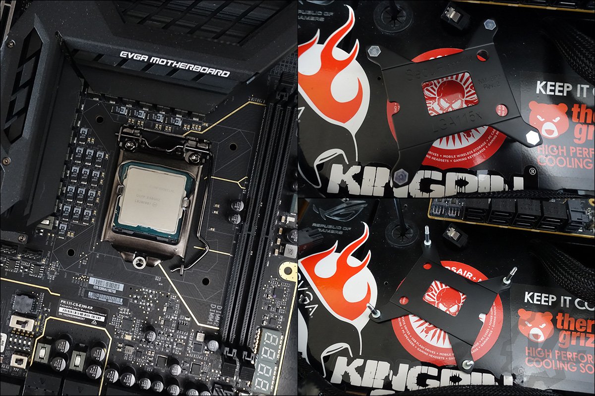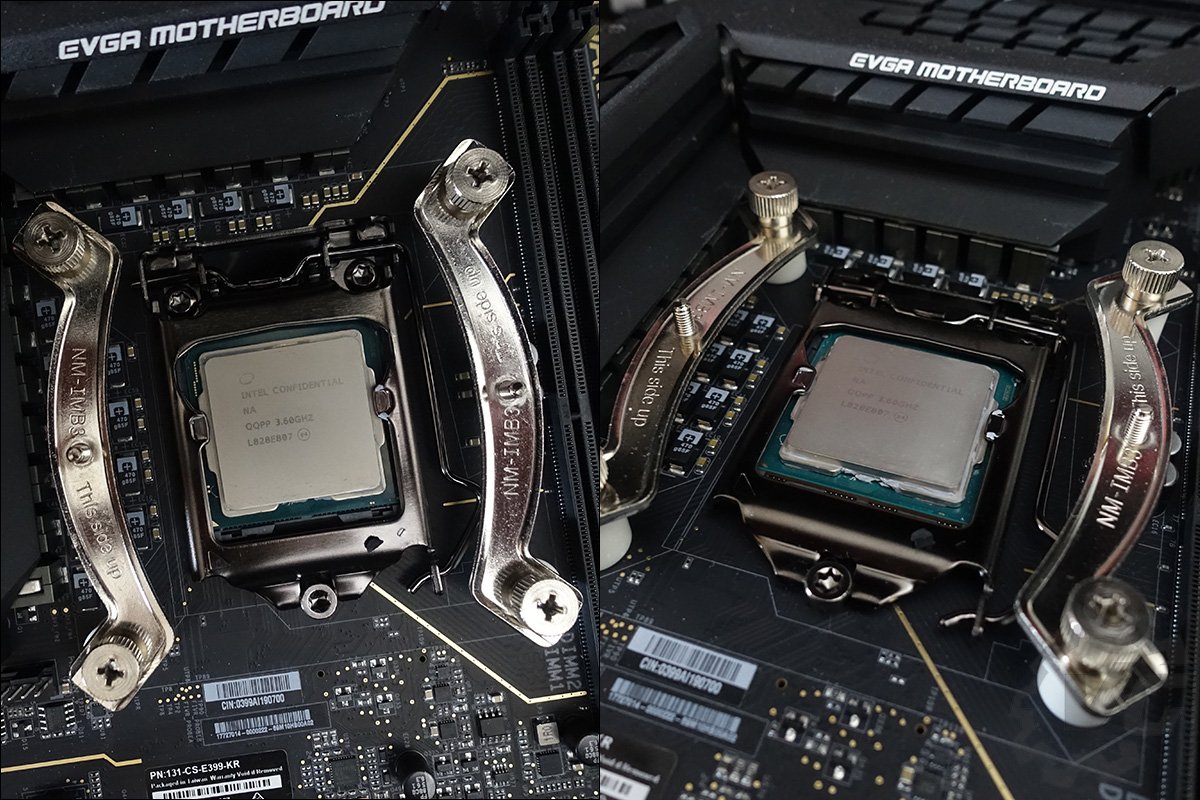 L’installation va se faire sur une carte mère « atypique » puisqu’il s’agit de la carte mère EVGA Z390 DARK. La particularité de celle-ci est l’emplacement des slots mémoires qui se trouvent en position haute. En ce qui concerne les tests et les relevés de températures, cela ne posera bien sur aucun problème. Si l’on associe Noctua à cette couleur bien particulière, on l’associe aussi à son système de fixation : le SecuFirm2. Les derniers système de refroidissement de Noctua utilise d’ailleurs ce principe de fixation, qui a déjà fait ses preuves à de nombreuses reprises. Puisqu’il s’agit d’une installation sur une carte mère disposant d’un socket LGA-1155, il faudra avoir recours à la plaque arrière fournie dans le bundle.