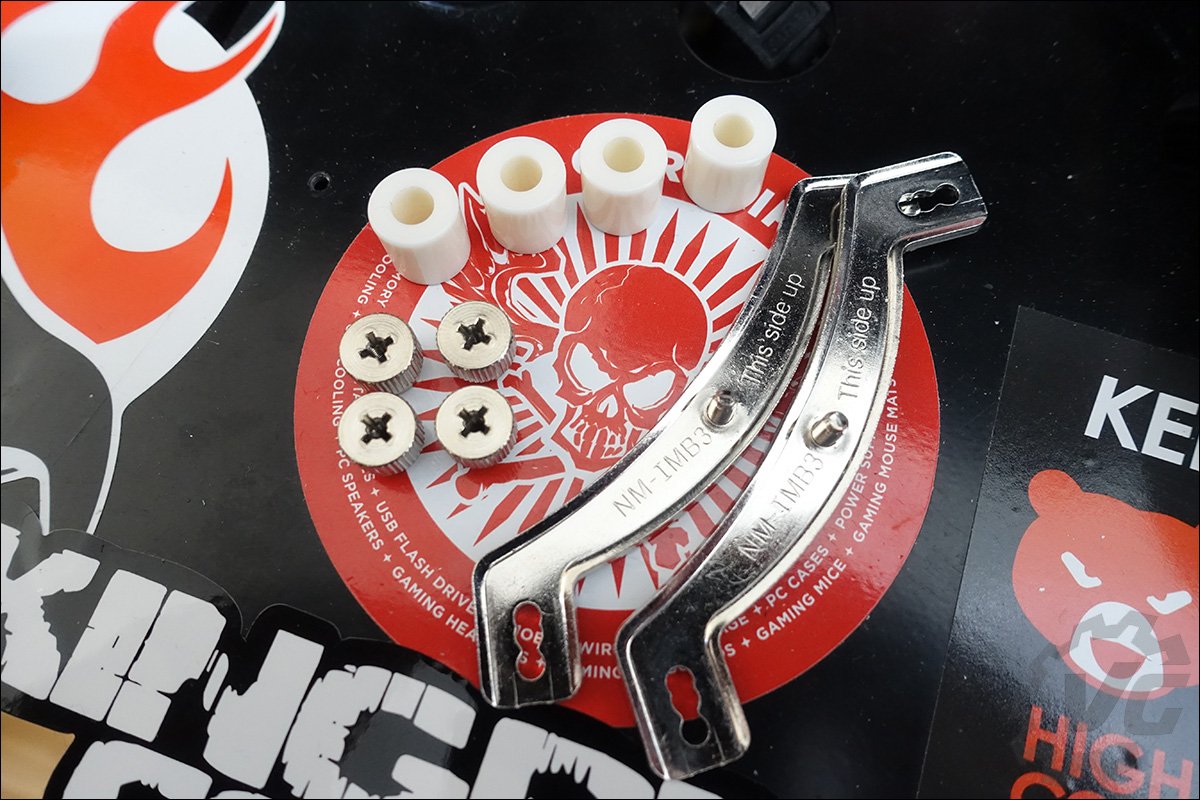 La première étape va donc consister à placer cette plaque à l’arrière de votre carte mère. L’étape suivante va consister à placer les 4 cylindres NM-IPS1. Attention sur les photos d’installation, j’ai installé les versions blanches mais après avoir remarqué mon erreur, ce sont les noirs qui ont été utilisé pour les tests. À ce moment, vous avez le choix de l’orientation du ventirad, cela dépendra de votre boitier et de la circulation d’air que vous souhaitez. Une fois les deux barres de fixation installées, il vous suffira de venir serrer les deux vis pré-installées sur la base de votre radiateur. La dernière étape consiste à replacer les deux ventilateurs !