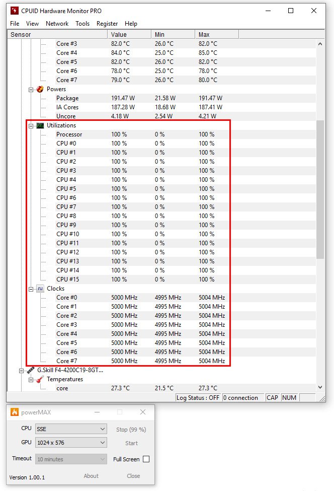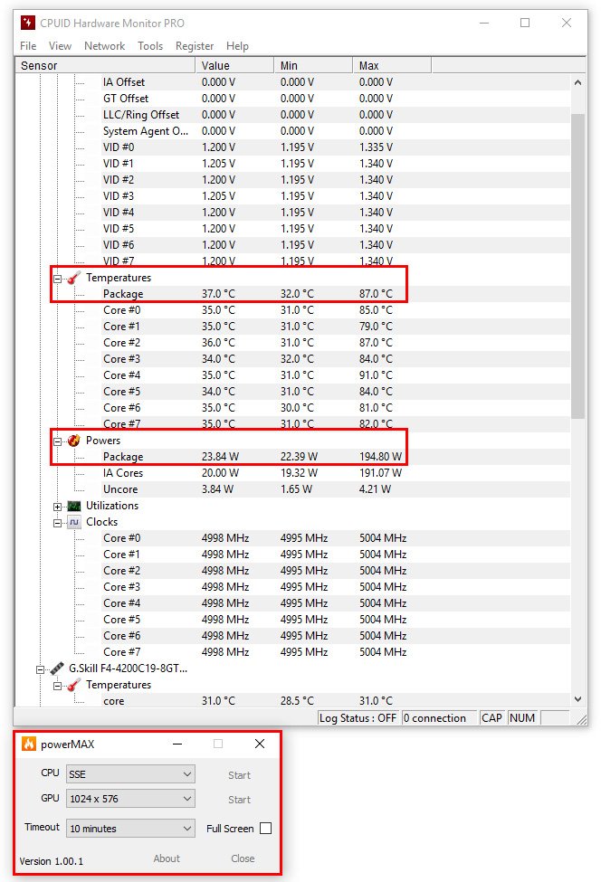 Voici comme exemple deux captures du logiciel Hardware Monitor PRO où l’on peut voir la température « package » max du processeur, la fréquence constante de 5000 MHz, la consommation de 194 watts ainsi qu’une utilisation max de 100 % de l’ensemble des cœurs. Sur l’exemple ci-dessous, on peut voir une température CPU de 87 °C, ce qui donnerait avec une température ambiante de 21,7 °C, un delta de 65,3.