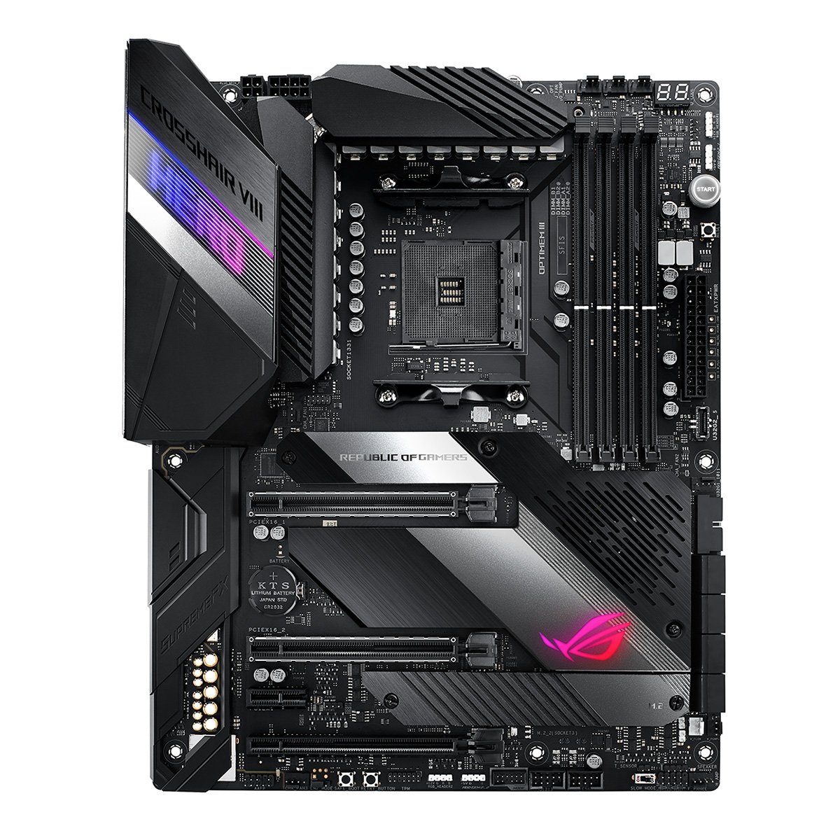Tout d’abord l’Asus Crosshair VIII Hero (Wi-Fi) architecturé autour du chipset X570 et disposant d’un socket AM4 compatible avec les processeurs des générations Ryzen précédentes ! Il s’agit là d’une très bonne nouvelle puisque cela permettra à l’utilisateur de faire une mise à jour pas à pas de sa configuration si il le souhaite. On retrouve quatre emplacements mémoires compatibles avec la DDR4 mais pas encore d’infos jusqu’à quelle fréquence. La carte semble disposer d’une large zone d’overclocking afin de faciliter, comme à son habitude, les tests sous froid. Le look de la carte, au niveau des radiateurs, ressemble énormément aux modèles Maximus XI d’Asus mais eux, compatibles avec les processeurs Intel.