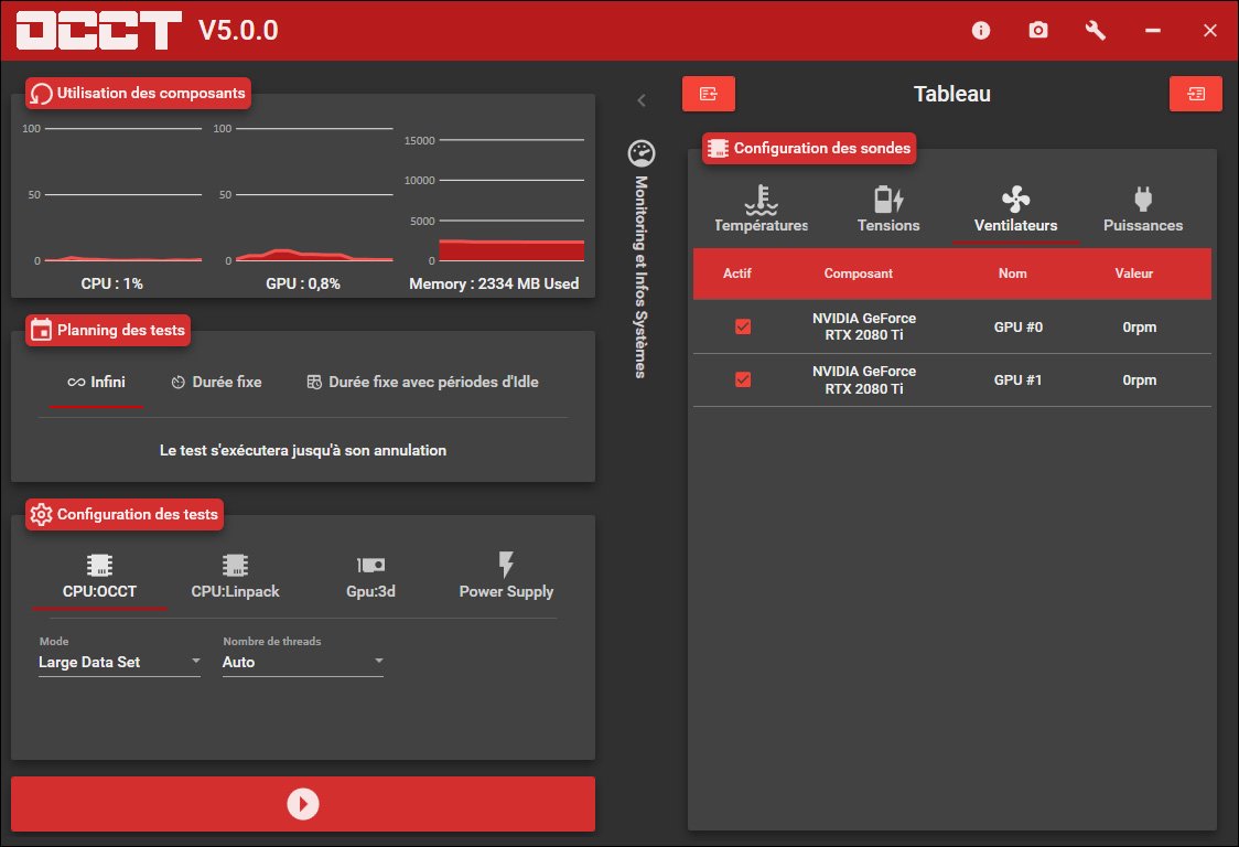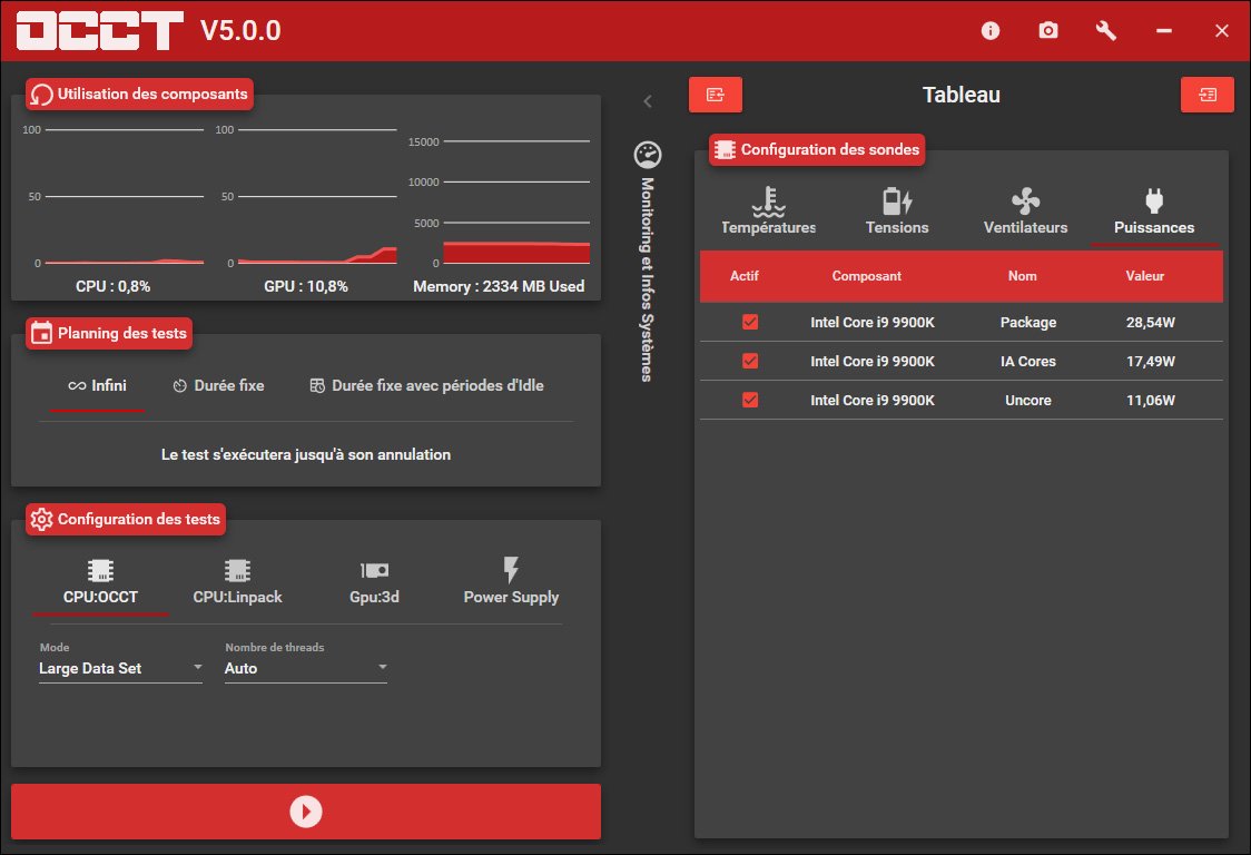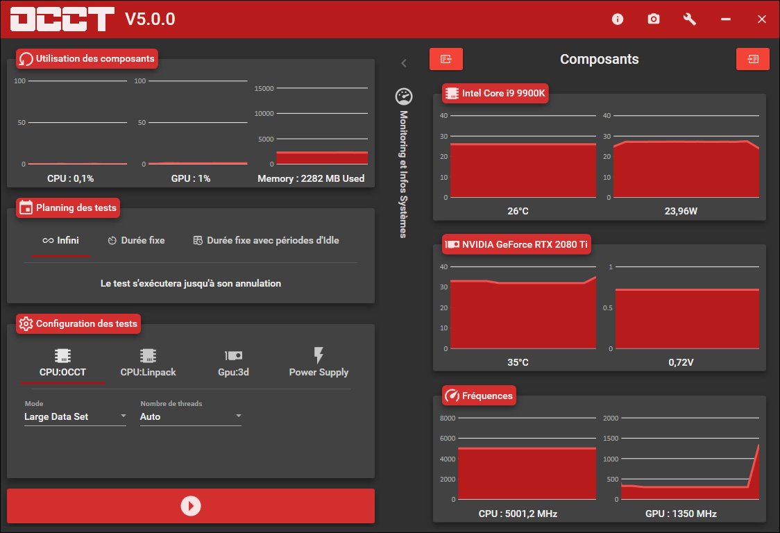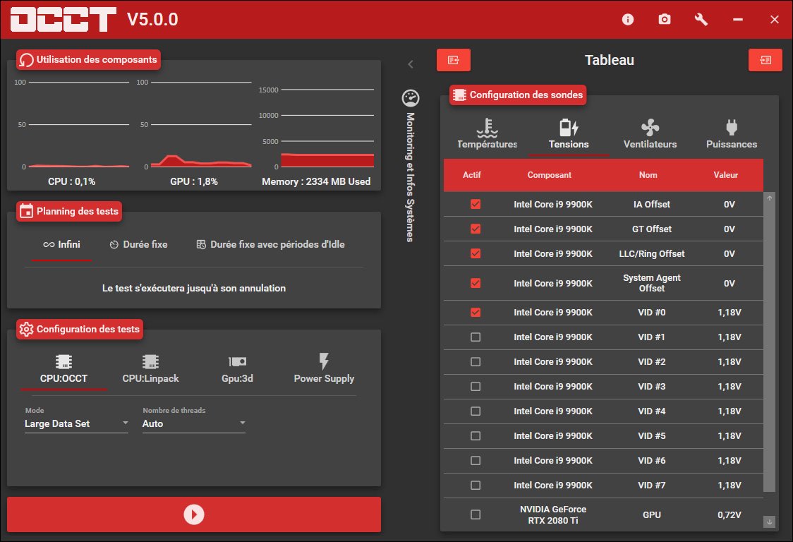 Le logiciel français OCCT continue son petit bonhomme de chemin et vient de passer, il y a quelques heures, en version 5.0.0. Pour ceux qui ne le connaissent pas, il s’agit d’un logiciel dont le but est de tester la stabilité de votre configuration et plus particulièrement celle de votre processeur. Il vous propose aussi un monitoring des tensions et températures de votre ordinateur. La première mouture de ce logiciel a été mis en ligne en 2003 par son concepteur Tetedeiench.