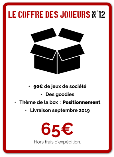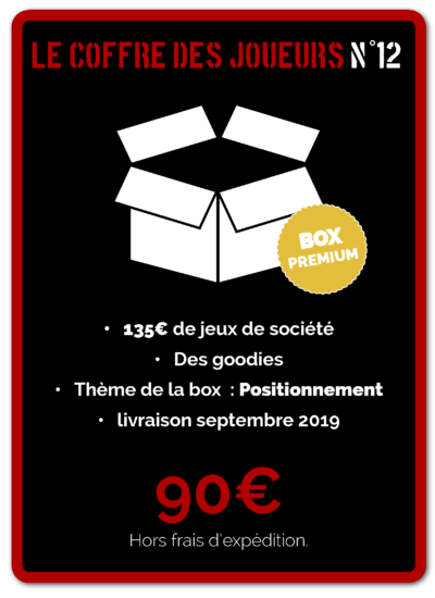 Si vous pouvez évidemment acquérir ces trois jeux, vous ne pourrez plus le faire en commandant cette box, puisqu’une fois le coffre des joueurs n°11 livré, le secret sur son contenu est divulgué, et le site propose déjà de commander la douzième. Cette fois, pas de box deux joueurs, pour la meilleure raison du monde : les concepteurs n’ont pas trouvé trois titres correspondant à leurs critères de format et de qualité, et préfèrent reporter les joueurs sur leurs box classique et premium que de mettre des œuvres qui ne les convaincraient pas dans un carton n’existant que pour le principe d’exister.