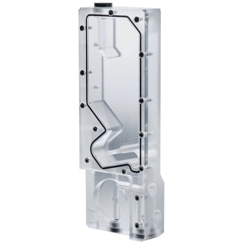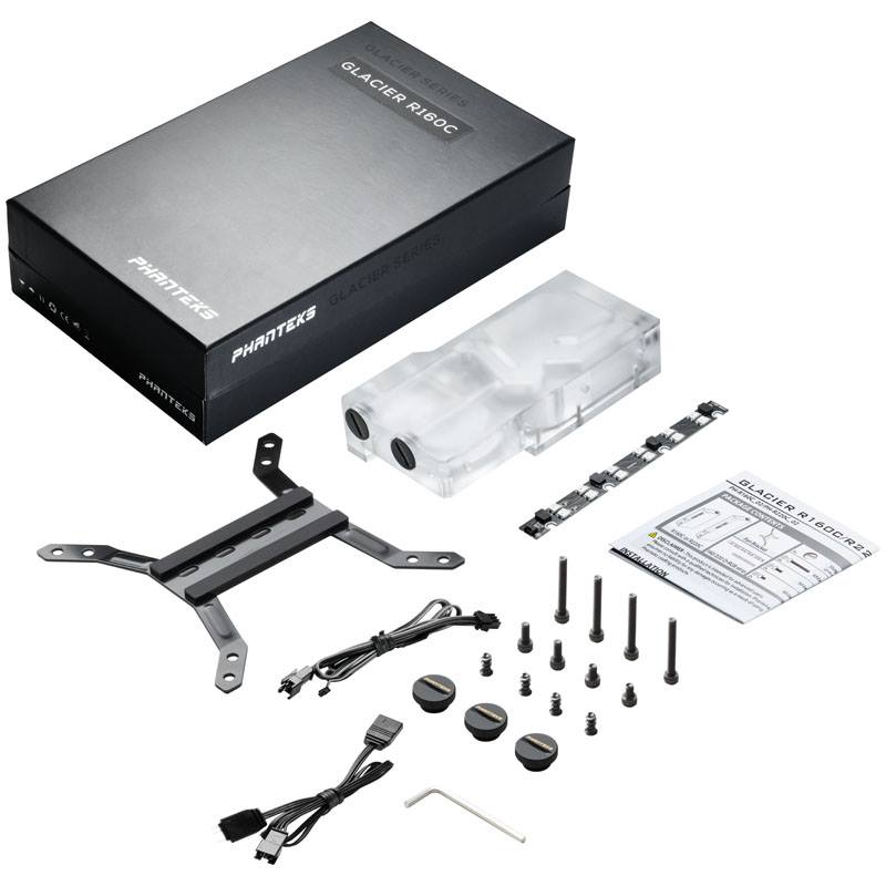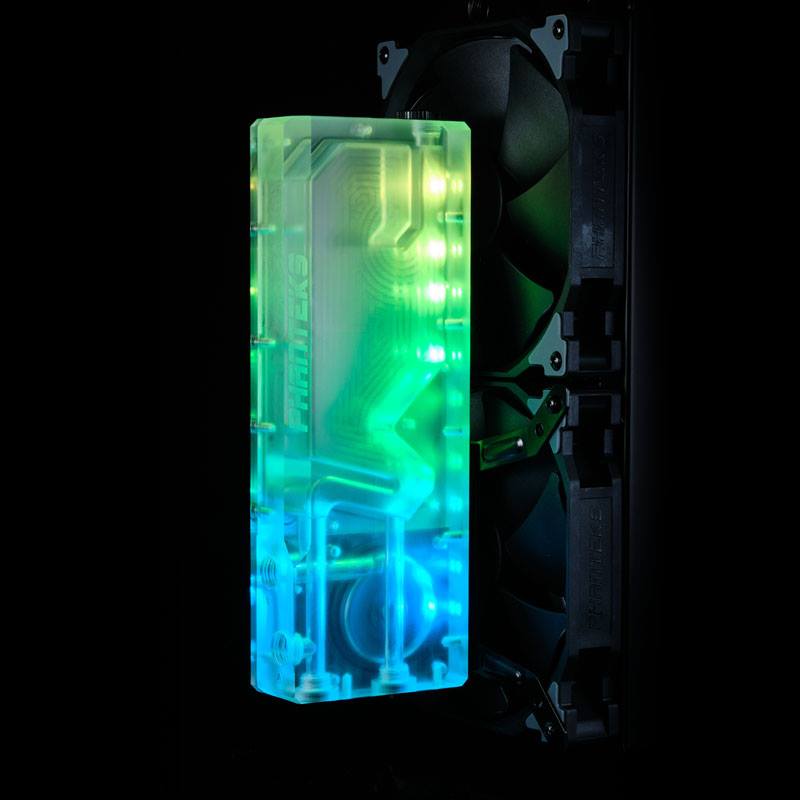 La seconde nouveauté proposée par Phanteks est l’arrivée de deux réservoirs portant la mention R160C et R220C. Pour rappel, nous avions passé en revue le réservoir R160. Ces deux réservoirs font parties de la gamme « Glacier » et sont spécialement conçus pour la pompe DDC. Le changement correspond à la présence d’une plaque arrière transparente favorisant l’impression d’espace. Auparavant il s’agissait d’une plaque noir. Le système RGB a lui aussi été revu et améliorée. Ils disposent d’un support de fixation en croix permettant de se placer sur des ventilateurs universels de 120 ou 140mm.