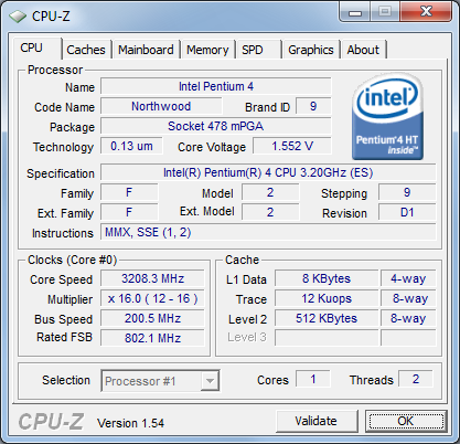 Sa carte d’identité : Intel Pentium 4 « Northwood » (512 KB L2 cache, FSB 100,133 puis 200 MHz, 1.55 V max core supply, Socket 478 pins, gravé en 130 nm), né en janvier 2002.