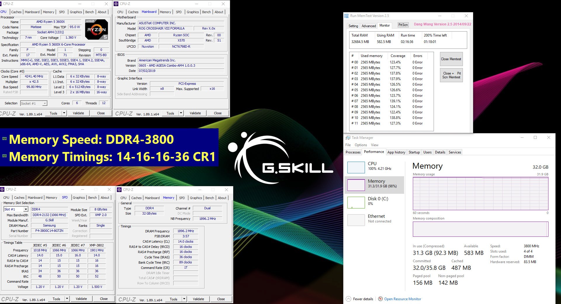 La capture de gauche montre le kit Neo à 3800 MHz en CL14-16-16-36 en 2 x 8 Go. Le processeur est quand à lui un AMD Ryzen 9 3900X et la carte mère, une MSI MEG X570 GODLIKE. Celle de droite, nous montre la parfaite stabilité de le version 32 Go sur une Asus ROG CROSSHAIR VIII Formula associée à un processeur AMD Ryzen 5 3600X.