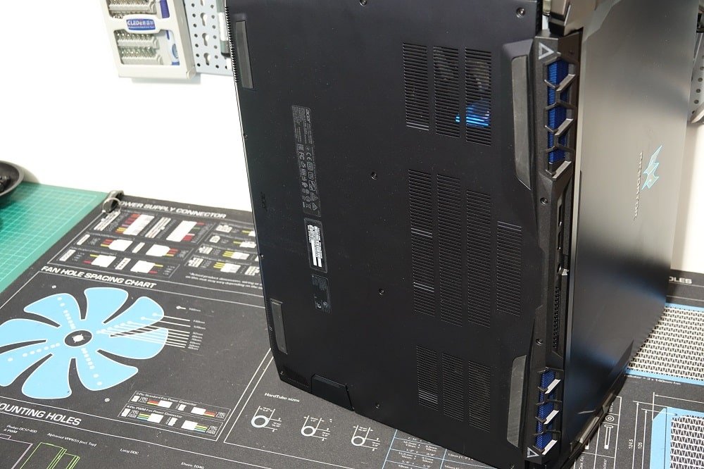 La conception de la partie articulée de l’écran a fait l’objet d’un grand soin. Les berceaux qui permettent l’articulation de l’écran sont ainsi fait d’une seule pièce d’aluminium. L’assemblage global est lui aussi de haut niveau : il est loin le temps des portables Acer avec des plastiques qui couinent. Au global, on dispose d’un produit extrêmement valorisant, alliant la sobriété amenée par les matériaux utilisés à une petite touche d’agressivité portée par l’association du logo Predator et de son bleu électrique.