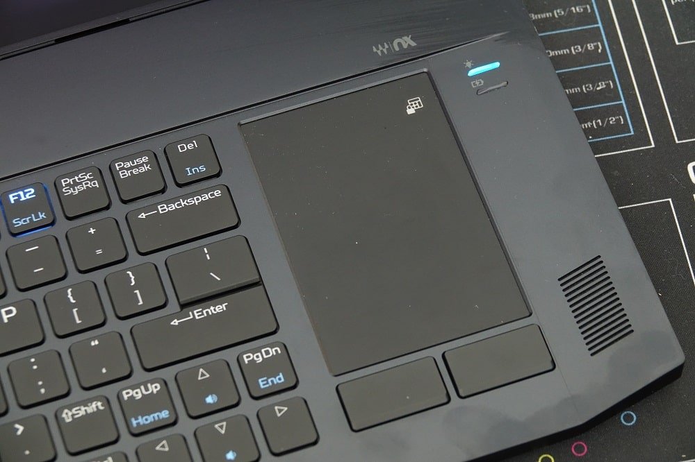 Le premier contact avec le Triton 900 interpelle : il est fin, presque « petit » alors qu’on dispose d’un écran 17,3″. Le portable ne dépasse pas les 23,75 mm d’épaisseur. Second effet : la bête respire la qualité, les matériaux utilisés en témoignent. Ici difficile de trouver du plastique sur le châssis, le « top » écran et les articulations sont en aluminium, le fond (sous le clavier) est en alliage de magnésium.