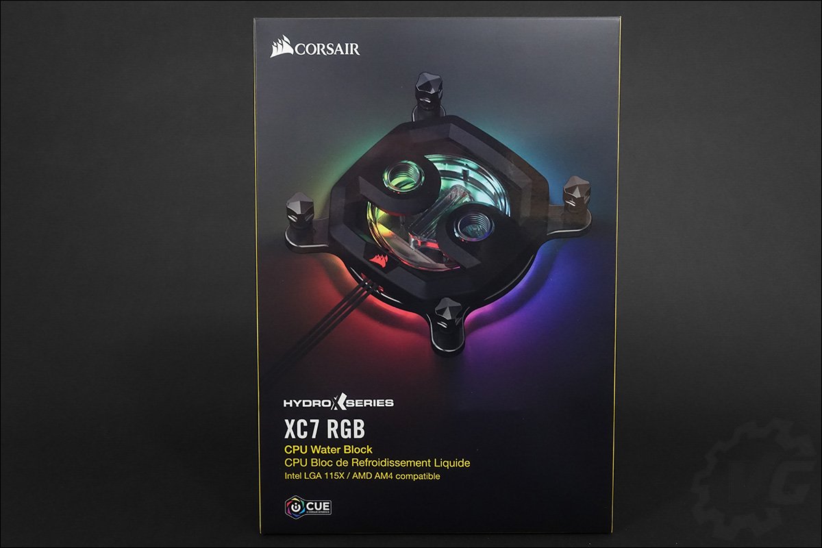 Débutons avec la pièce maîtresse de notre système de refroidissement : le waterblock Hydro X Series XC7 RGB. Il est de couleur noir et est compatible avec les sockets Intel 115x et AMD AM4. Corsair dispose de trois autres modèles, compatibles avec les deux autres sockets actuels : le 2066 de chez Intel et le sTR4 d’AMD. Notre modèle est disponible au prix de 79,90 euros directement sur le site de Corsair ou chez LDLC par exemple. Le XC7 bénéficie d’un système de rétroéclairage RGB composé de 16 LED paramétrables individuellement. Pour la gestion de celle-ci, vous devrez utiliser le contrôleur Corsair Commandeur PRO dont nous vous parlerons plus bas.