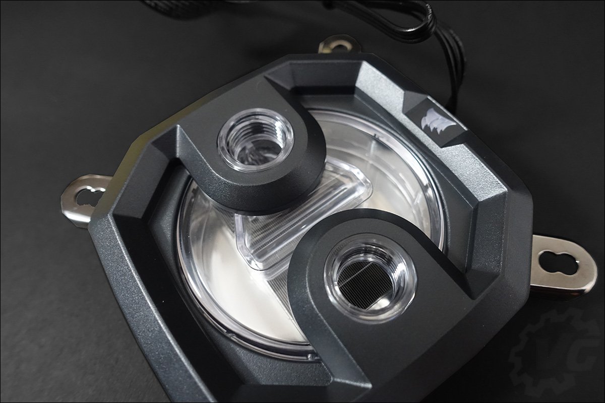 Corsair ne disposait au départ que de waterblock GPU pour les cartes de référence Nvidia. Aujourd’hui, le catalogue continue de s’étoffer. Nous avons d’ailleurs reçu un exemplaire du XG7 RGB compatible avec l’Asus RTX 2080 Ti Strix OC que nous avons testé il y a quelques temps. Nos premières impressions sont très positives surtout en ce qui concerne le design de ce block. La face avant se compose d’une partie en métal et au centre se dévoile les micro-ailettes ainsi qu’une petite roue qui vous permet de vous assurer du fonctionnement de la pompe. C’est plutôt une très bonne idée ! Il s’agit d’un waterblock intégral, c’est-à-dire qui prendra en charge le refroidissement de la puce graphique, des puces mémoires ainsi que de l’étage d’alimentation.