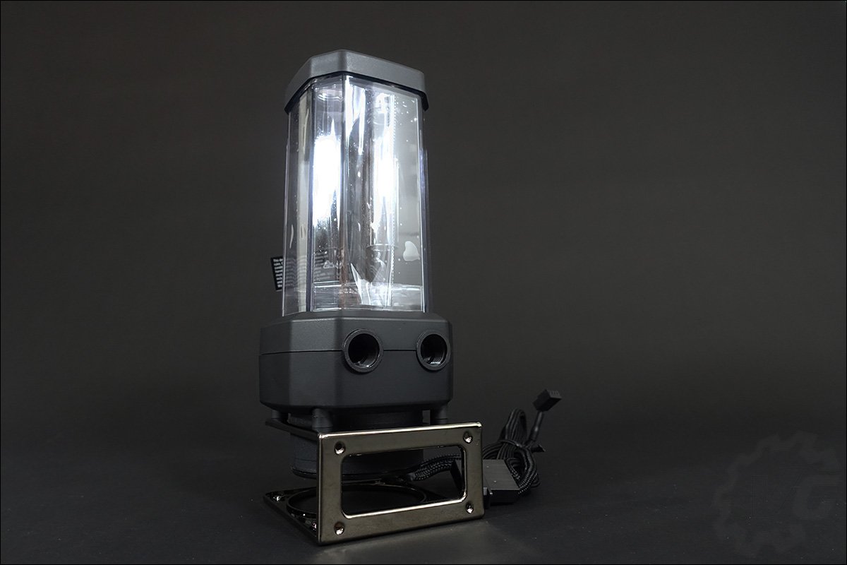 En ce qui concerne les entrées et sorties, elles sont au nombre de quatre au niveau de la pompe. Ce choix est fait afin de vous laisser la plus grande liberté dans la conception de votre boucle de refroidissement. Le sommet du réservoir bénéficie aussi de deux entrées. Cette XD5 dispose aussi d’un rétroéclairage RGB à associer au Commander PRO. On retrouve aussi à l’intérieur du réservoir un anti-cyclone dont le rôle est d’éviter la création d’un « cyclone » et de faciliter l’élimination des bulles d’air au sein de votre circuit liquide.