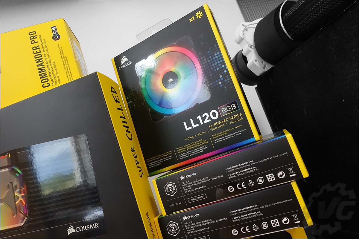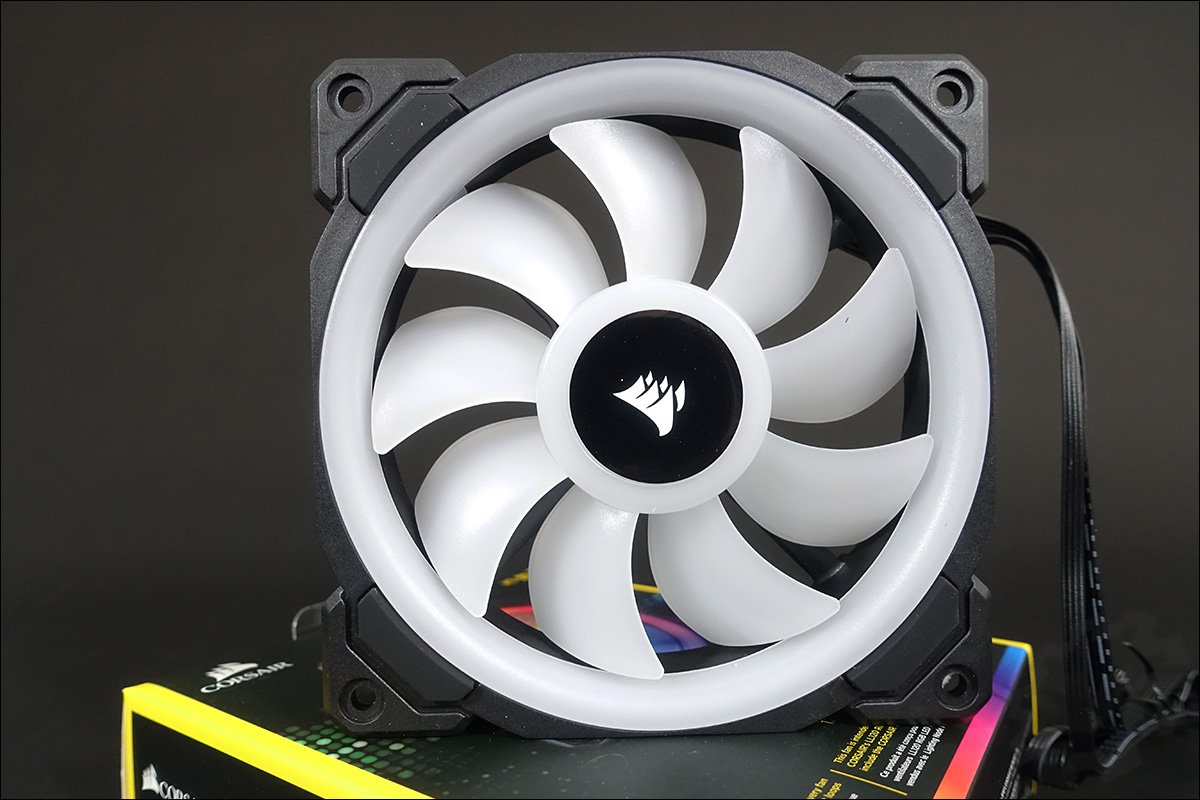 Les ventilateurs Corsair LL120 RGB sont équipés de 16 LED RGB indépendantes. Elles sont réparties sur le cercle extérieur ainsi que sur celui du centre. Ils possèdent comme caractéristique technique, une vitesse de rotation comprise entre 600 et 1500 RPM, un débit d’air max de 43,25 CFM, le tout pour des nuisances max de 24.8 dBA. Ces trois ventilateurs viendront prendre place sur le radiateur XR7 de 360 mm.