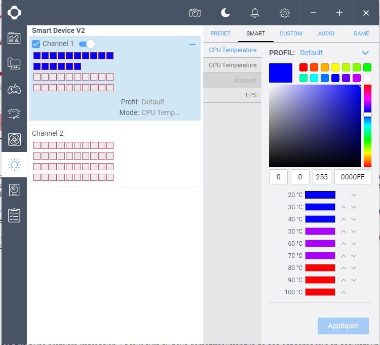 Pour repasser sur le côté esthétique, le logiciel vous permettra divers options de luminosité. Vous pourrez donc opter pour par exemple une lumière fixe en RGB (16,8 millions de couleurs) ou faire parler votre originalité. Par exemple, j’ai opté sur une fonction changeant la lumière en fonction de la température du CPU. En fonction de celle-ci, la couleur va changer. Cela passera d’un bleu très clair à un rouge des plus sombres. Une manière agréable de savoir si vous devez lever le pied.