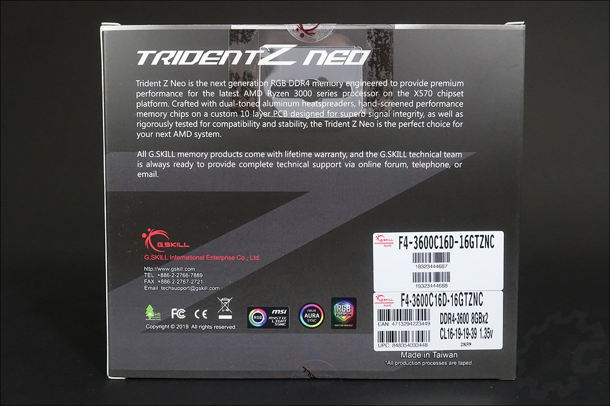Le kit GSKILL est arrivé dans une boite assez compacte. Le design du packaging est assez proche de celui des autres modèles Trident Z hormis pour les versions Royal qui elles, disposent d’un écrin plus flatteur. On retrouve sur la face avant le logo de la marque ainsi que celui « AMD Ryzen », confirmant que ce kit est bien spécifiquement dédié à cette plate-forme. À l’arrière, l’origine de cette nouvelle série « Neo » ainsi que les caractéristiques complètes. Notre kit est composé de deux barrettes mémoires de 8 GB chacune pour un total de 16 GB, protégées dans une coque plastique transparente.