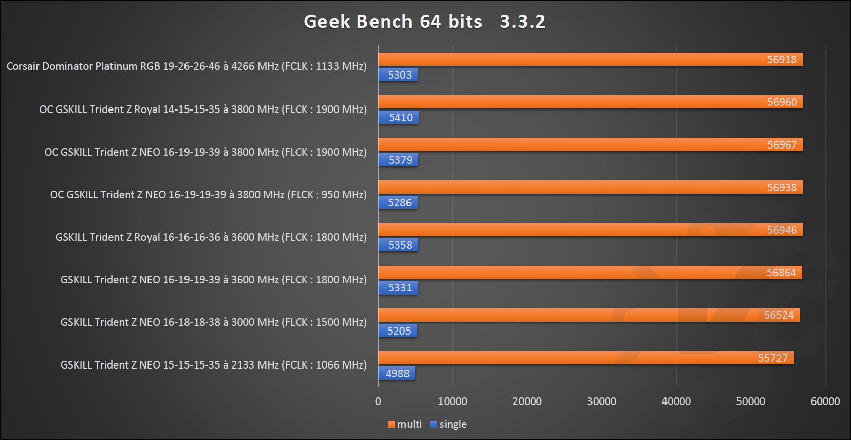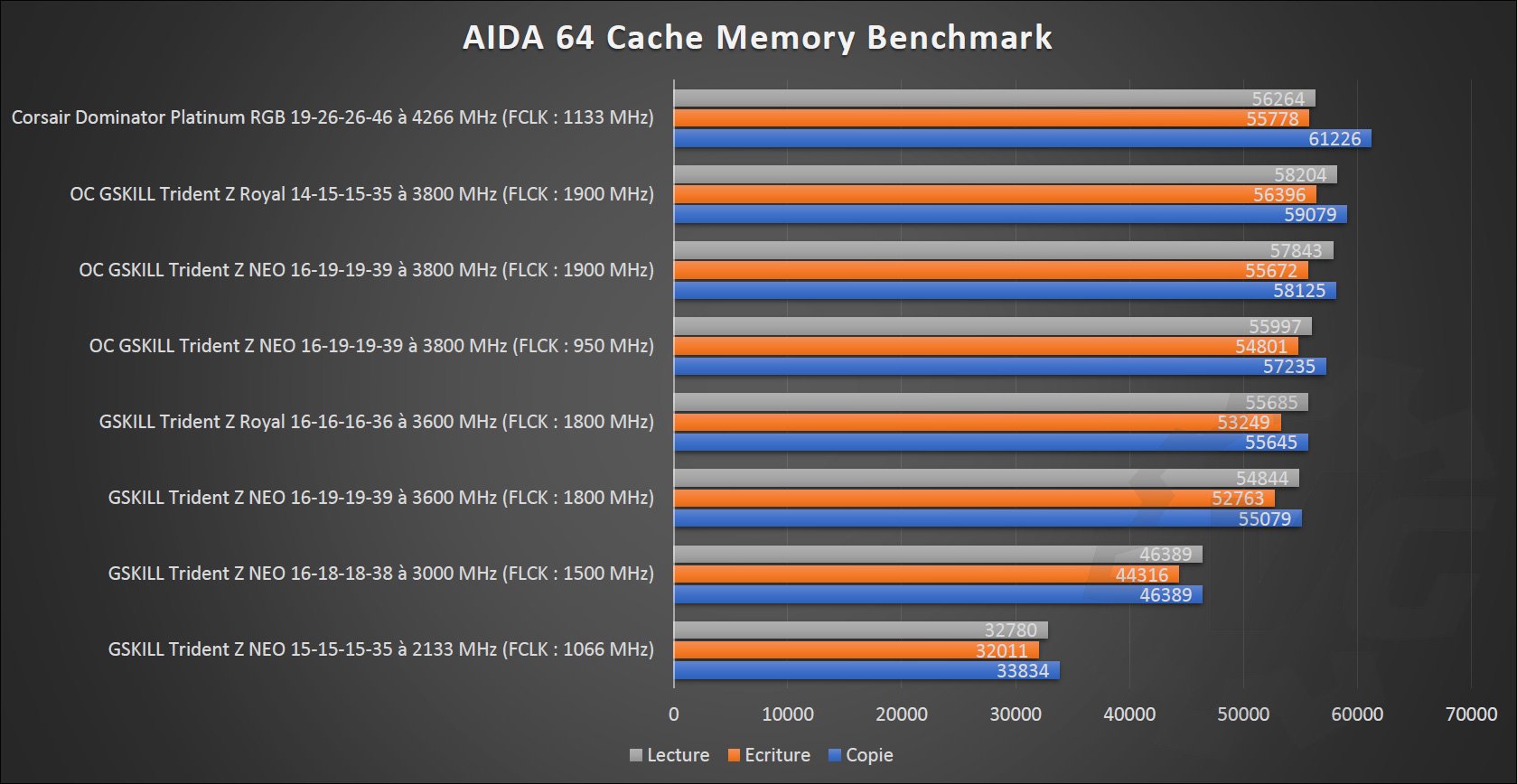Comme nous vous disions ci-dessus, GSKILL a également dans ses cartons un kit Neo disposant des caractéristiques suivantes : 14-16-16-36 à 3800 MHz ! Notre exemplaire de la série Neo est incapable de tenir de tels timings c’est pourquoi nous avons overclocké notre kit GSKILL Trident Z Royal à 3800 MHz en 14-15-15-35 à 1,50 volt afin d’estimer ce que pourrait donner le kit Neo disposant de ces caractéristiques. Voici à présent les résultats comparatifs.