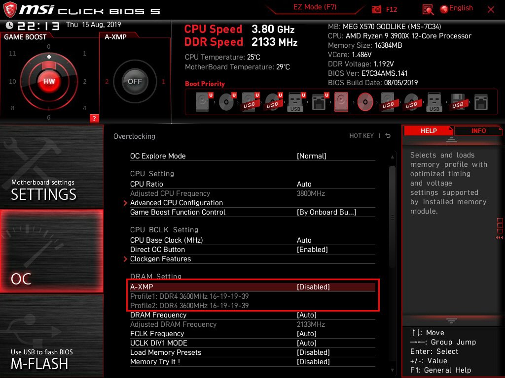 Nous savons que pour la plus part d’entre vous, c’est une évidence, mais nous remarquons encore très souvent que c’est un oubli pour certains utilisateurs. Une fois votre kit mémoire inséré sur votre carte mère, celui-ci se règle selon une fréquence par défaut qui est de 2133 MHz avec des timings de 15-15-15. Inutile de dire que vos performances seront bridées et qu’il est donc obligatoire de configurer votre kit dans le bios ! Pour ce faire, rien de compliquer, direction le bios en pressant la touche « Suppr » lors du boot de votre carte mère. Une fois dans le bios, soit vous activez le XMP (A-XMP ici) soit vous régler manuellement votre kit. La solution la plus facile est de passer via le profil XMP qui correspond à votre kit mémoire. Comme vous pouvez le voir sur les captures ci-dessous, notre MSI en reconnait deux mais qui sont identiquement les mêmes. Vous en sélectionnez un des deux, vous sauvegardez et voilà, votre kit mémoire est à présent configurer correctement !