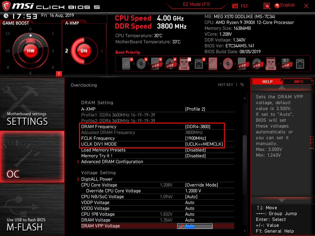 Voici la modification effectuée au sein du bios de notre MSI MEG X570 Godlike. Nous avons donc forcé le mode 1:1 et passé la fréquence du FCLK à 1900 MHz, ce qui représente l’extrême limite.