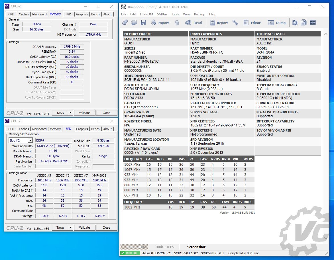 Aucun souci au niveau de CPU-Z où le kit est parfaitement identifié dans l’onglet « SPD ». J’ai également découvert un autre logiciel, Taiphoon Burner, qui permet lui aussi d’avoir pas mal d’informations sur les kits mémoires.
