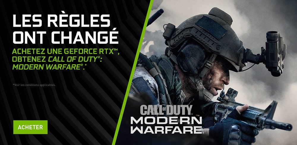 Le nouveau Call of Duty : Modern Warfare débarque le 25 octobre sur plusieurs plates-formes et notamment sur PC. Nvidia et Activision annoncent aujourd’hui le bundle GeForce RTX Call of Duty : Modern Warfare ! Pendant un un temps limité, les joueurs recevront ce jeu pour l’achat d’une carte graphique éligible GeForce RTX 2080 Ti, 2080 SUPER, 2080, 2070, 2060 SUPER ou 2060, d’un ordinateur portable ou de bureau équipés d’un de ces GPU éligibles. « Ti »